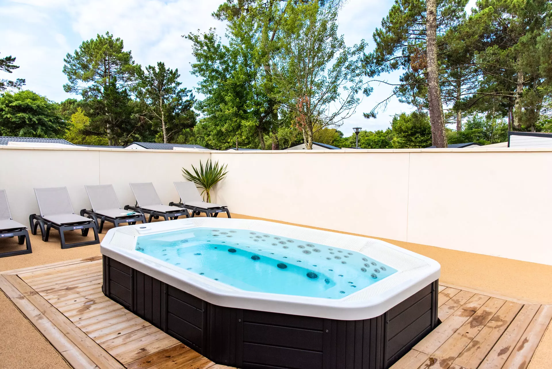 - Extérieur : salon de jardin, chiliennes ou bains de soleil