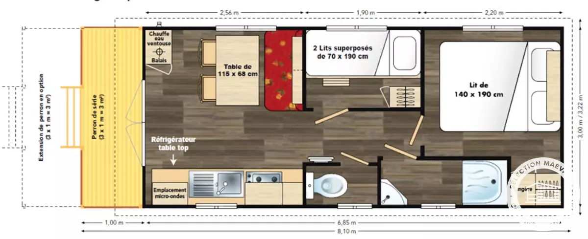 A noter : Les modèles du locatif peuvent varier. Les tailles de lits mentionnées sont non contractuelles. Il est possible d'avoir de légères différences de tailles selon les modèles de locatifs. La disposition des lits et la décoration peuvent également varier.