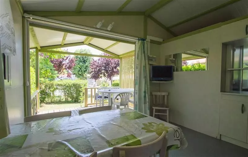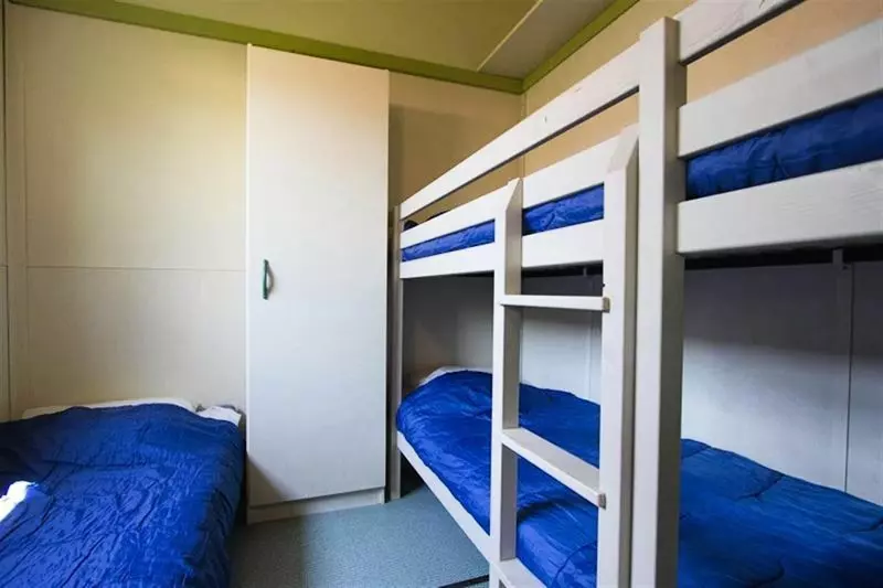 Chalet 4 Pièces 6 Personnes composé d'un salon avec coin cuisine intégré, d'une chambre avec un lit double, d'une chambre avec deux lits jumeaux, d'une chambre avec deux lits superposés, d'une salle de douche avec WC séparés et d'une terrasse semi-couverte de 14m².