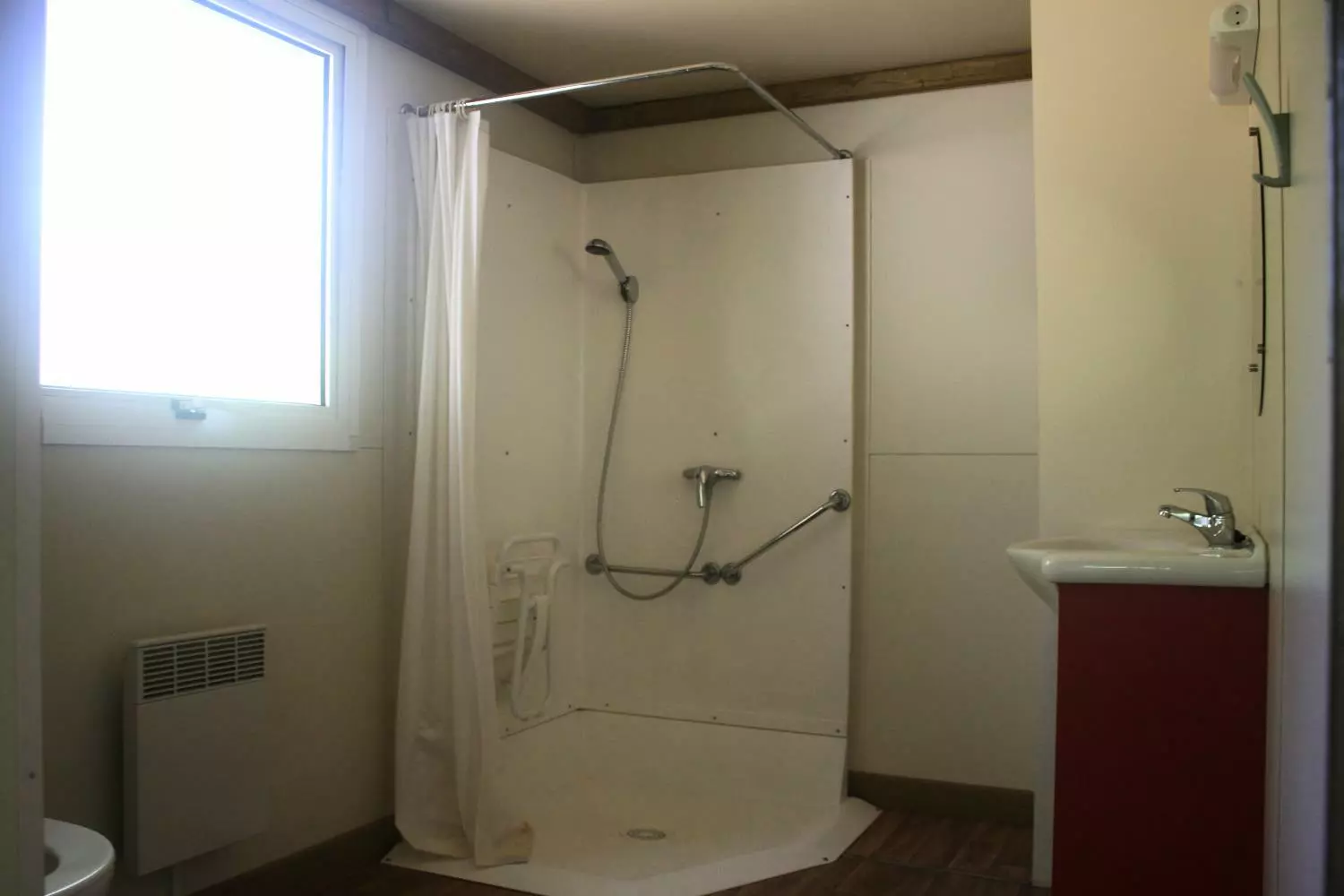 Salle de douche avec chaise et WC adaptés