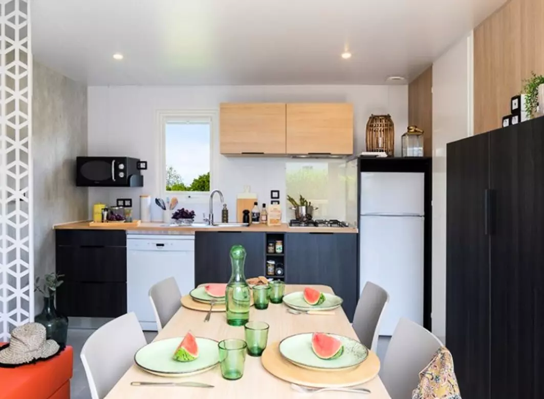 Cottage 3 Pièces 4/5 Personnes composé d'un séjour avec coin cuisine équipé, d'une chambre avec un lit double (140x190) et d'une chambre avec deux lits simples, d'une salle de douche avec WC séparés et d'une terrasse privative de 12m² avec salon de jardin.
