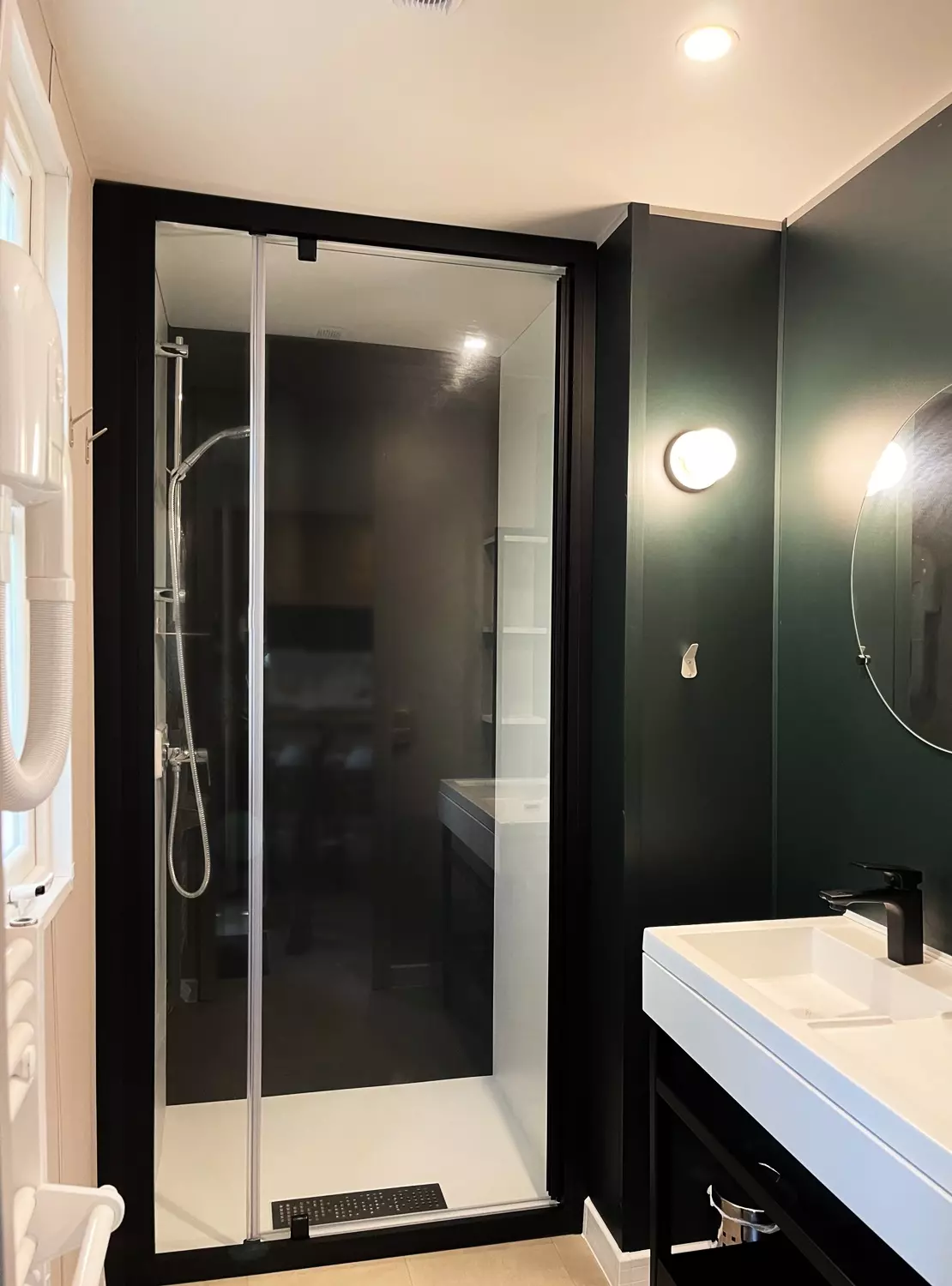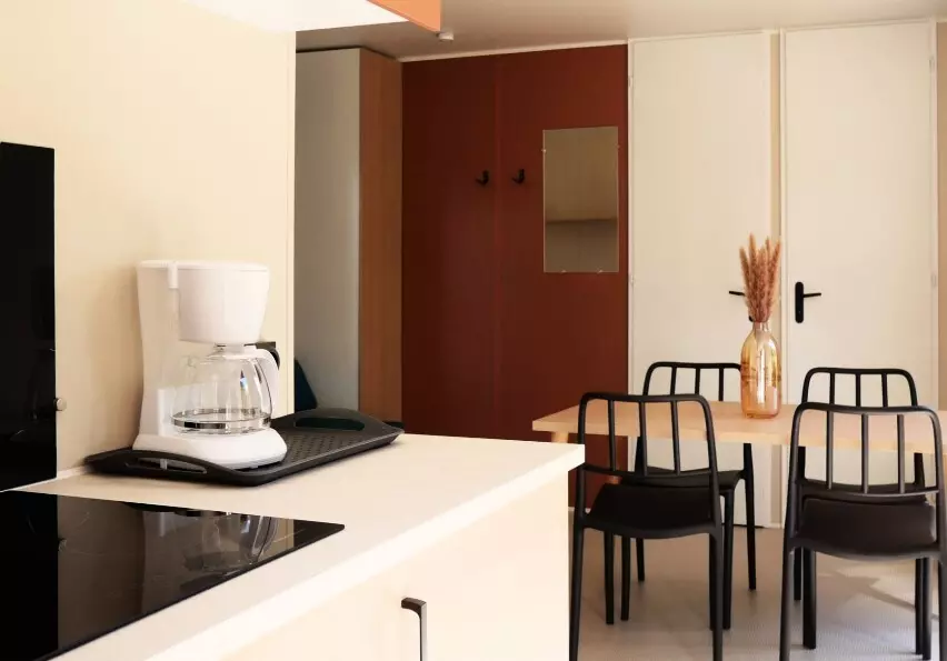 - Coin cuisine : plaques vitrocéramiques, réfrigérateur table top, lave-vaisselle, four micro-ondes, cafetière, vaisselle/couverts