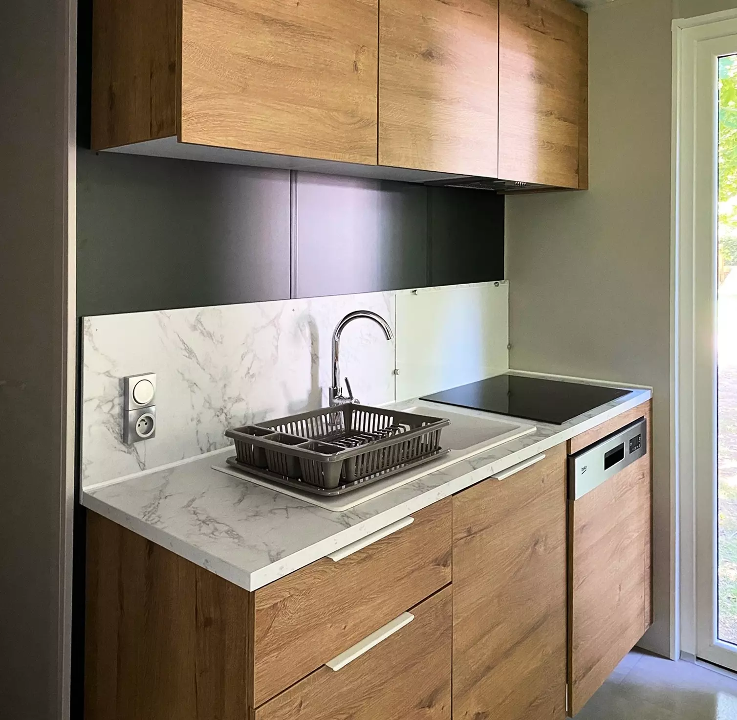 - Coin cuisine équipé : plaque vitrocéramique, réfrigérateur/congélateur, lave-vaisselle, four micro-ondes, vaisselle/couverts