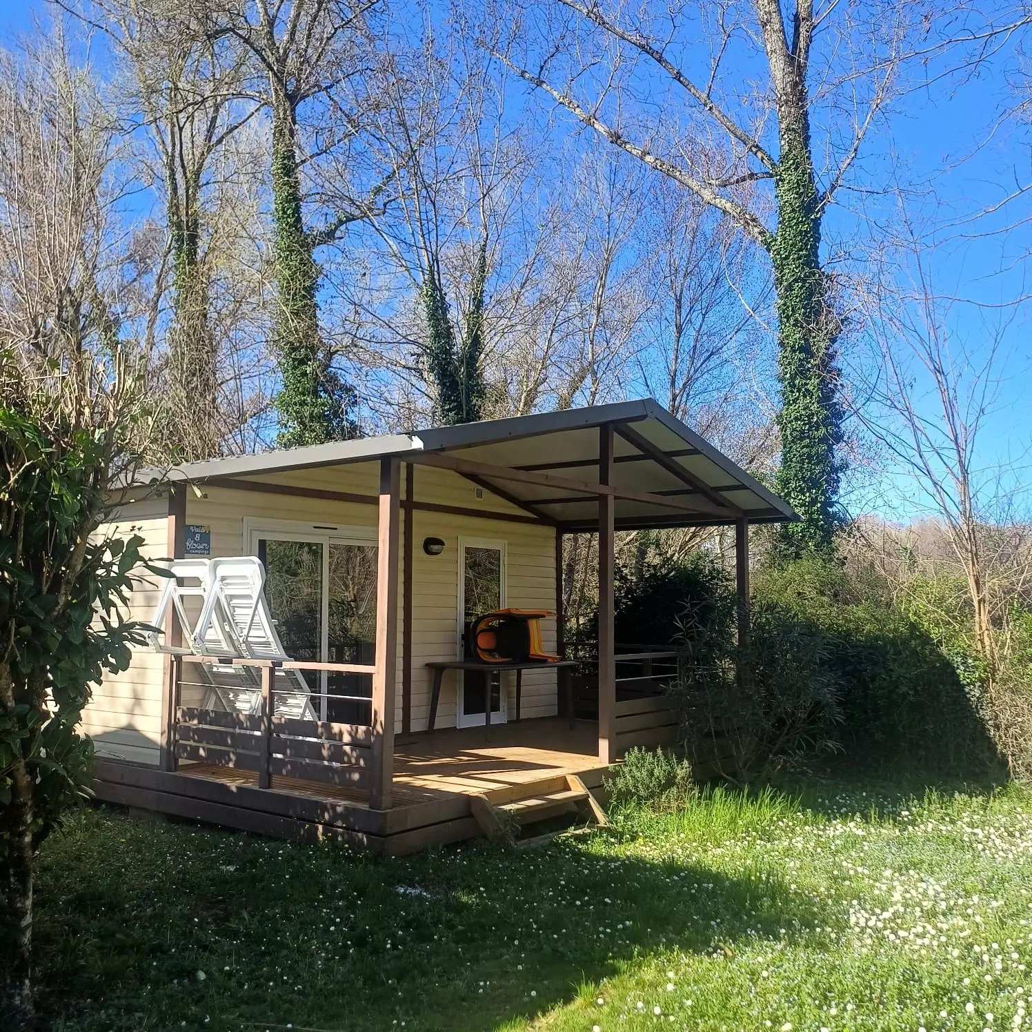 Chalet TINY 20 m², avec terrasse couverte, 1 chambre, oreillers et couettes fournis. Chambre : lit de 140 x 200 cm. Salle à manger salon- Salle d'eau : lavabo, douche et WC Cafetière électrique et four micro-ondes Terrasse couverte avec salon de jardin et bains de soleil. Animaux acceptés avec supplément.