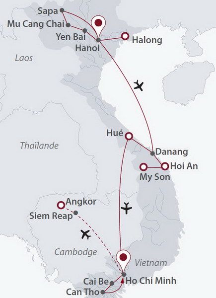 La capitale Hanoi, la station d’altitude de Sapa, Saigon et les trois joyaux du Vietnam classés à l’UNESCO : la baie d’Halong, Hoi An et Hué.