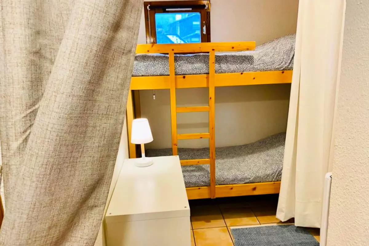 - une chambre "cabine" sans porte (juste 1 rideau) avec lit superposé (attention ils sont assez étroits et petit, cela convient mieux à des enfants que des adultes),