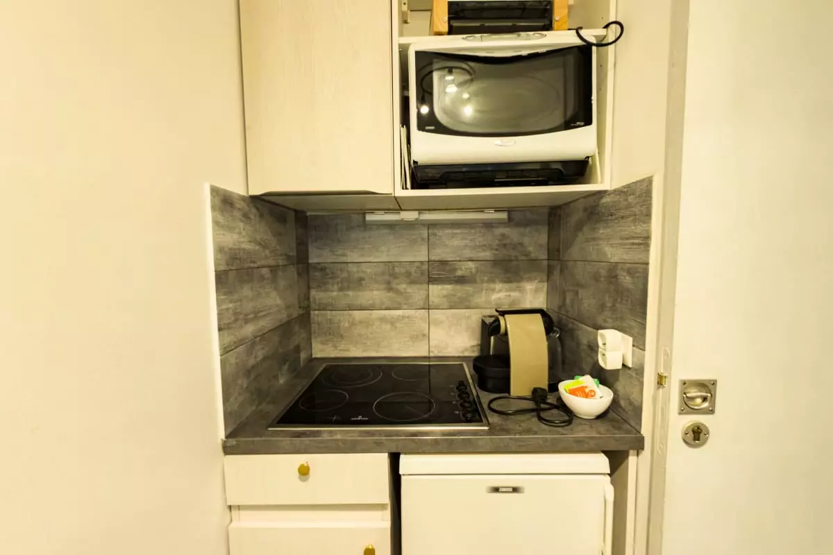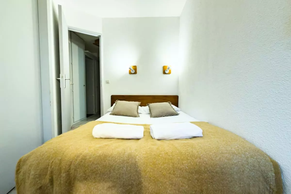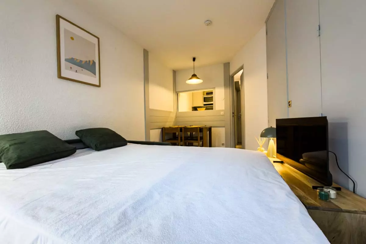 L’espace nuit séparé par une cloison mobile comprend un lit double (140x190) pour des nuits paisibles, tandis que le salon offre un canapé convertible très confortable. Après une journée en montagne, détendez-vous dans la salle de bain équipée d’une baignoire.