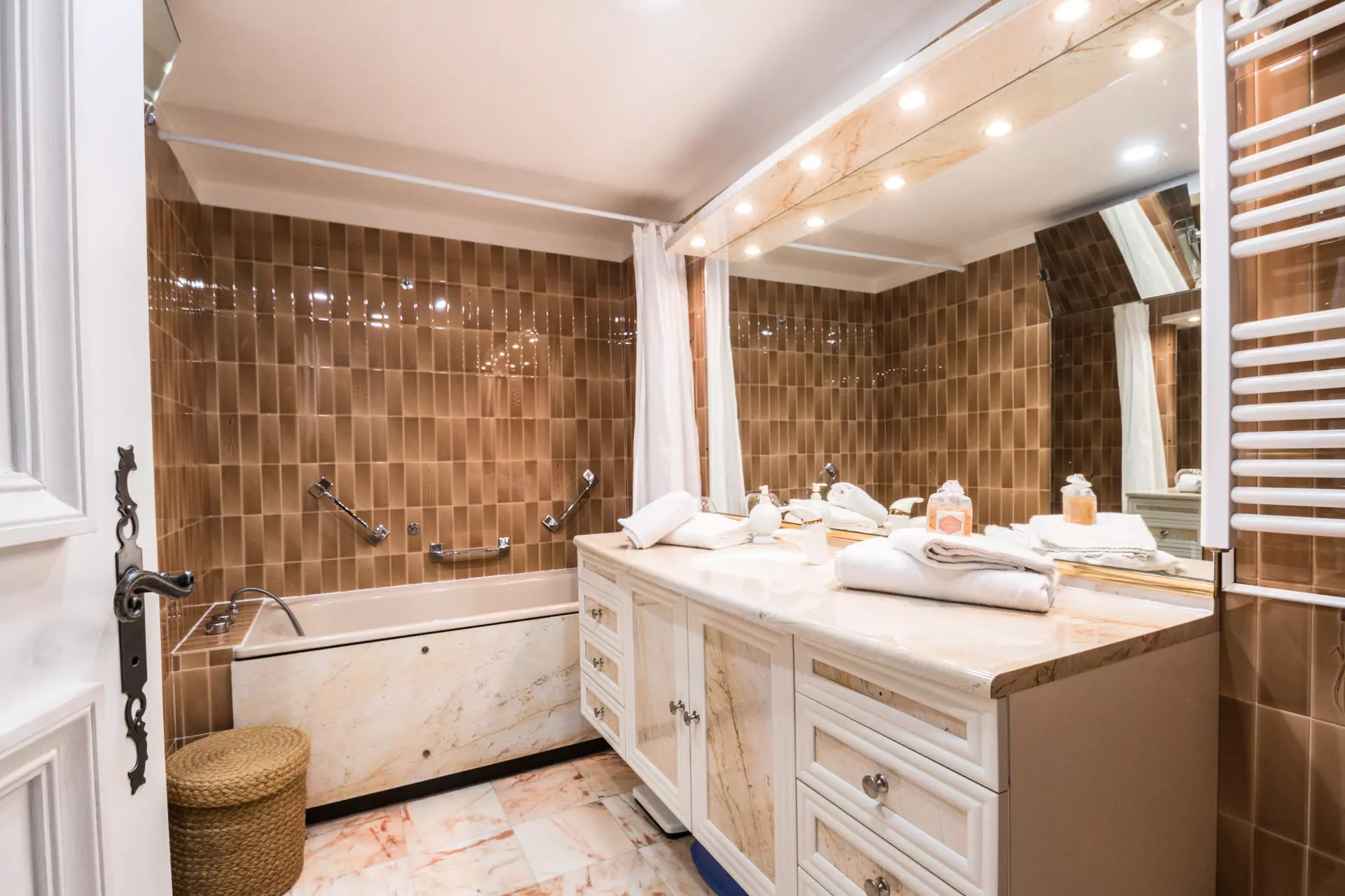 - Une salle de bains avec toilettes et sèche-serviettes