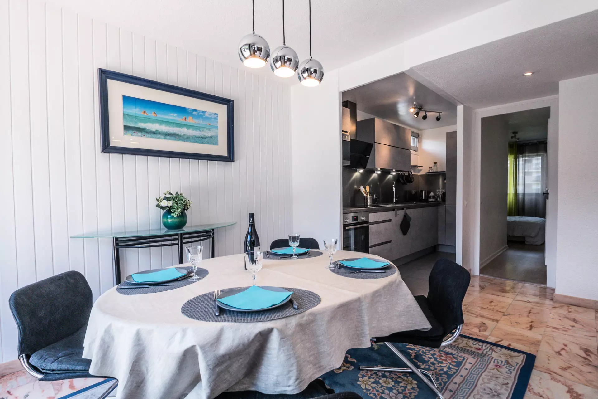 - Kitchenette ouverte équipée (four, micro-ondes, plaques vitrocéramiques, hotte, réfrigérateur, cafetière filtre, grille-pain, bouilloire)