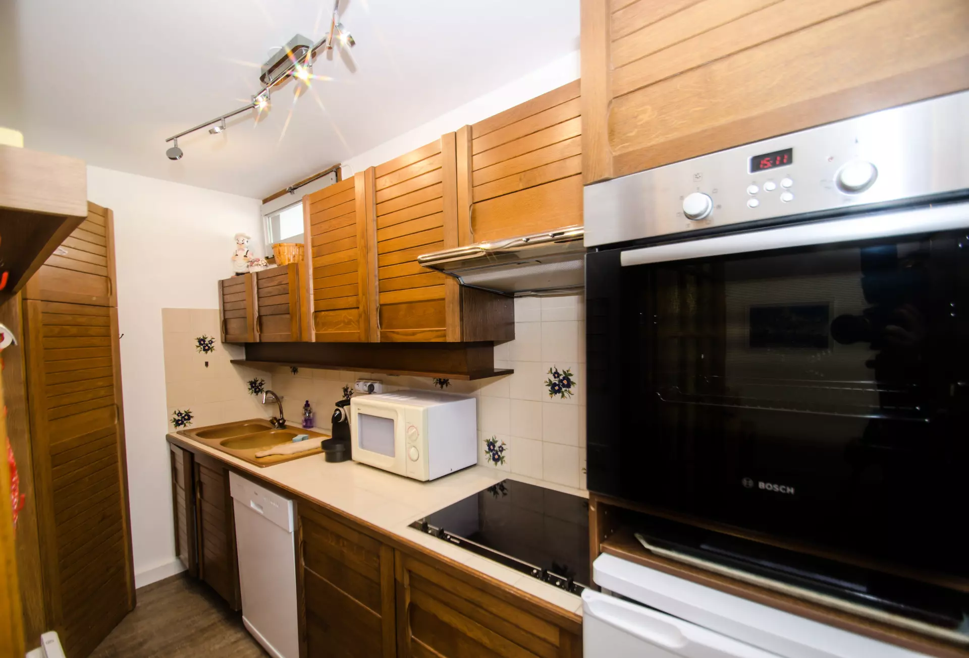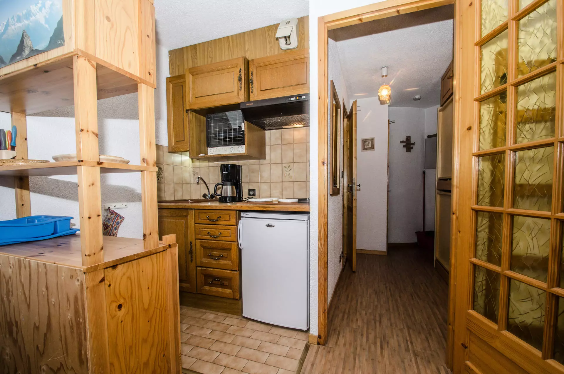 - Coin cuisine équipée (plaques vitrocéramiques, micro-ondes, réfrigérateur, cafetière filtre, bouilloire)