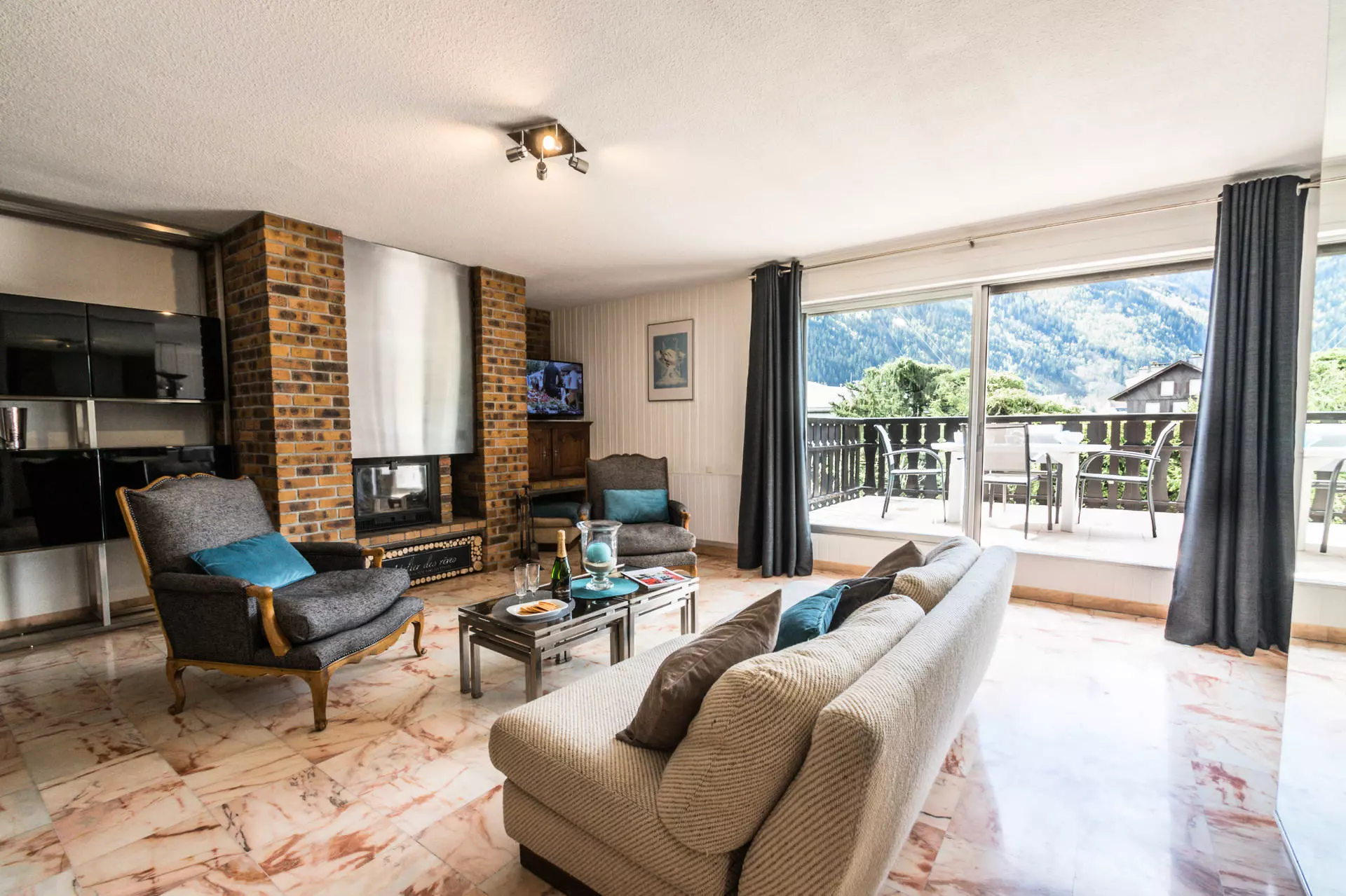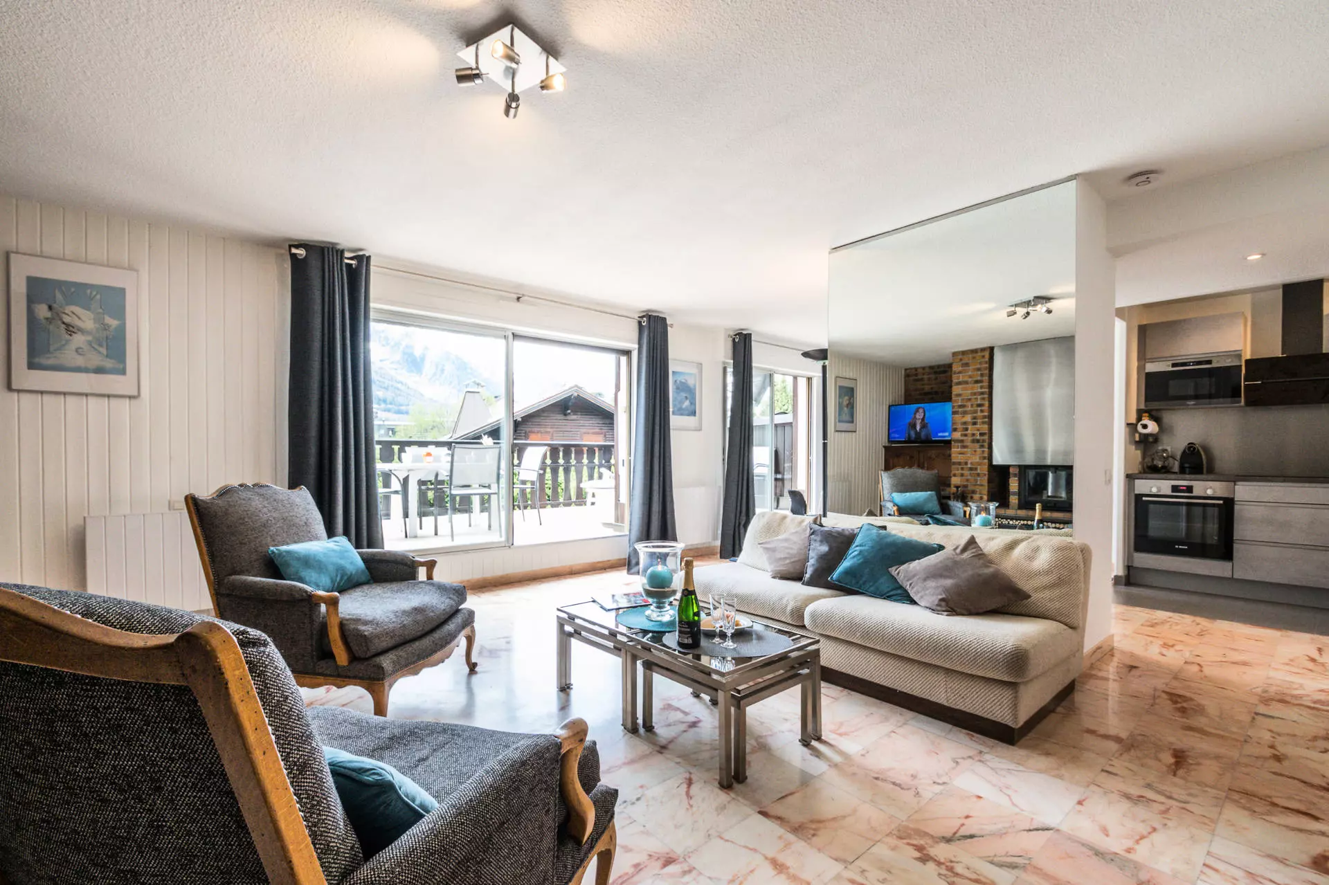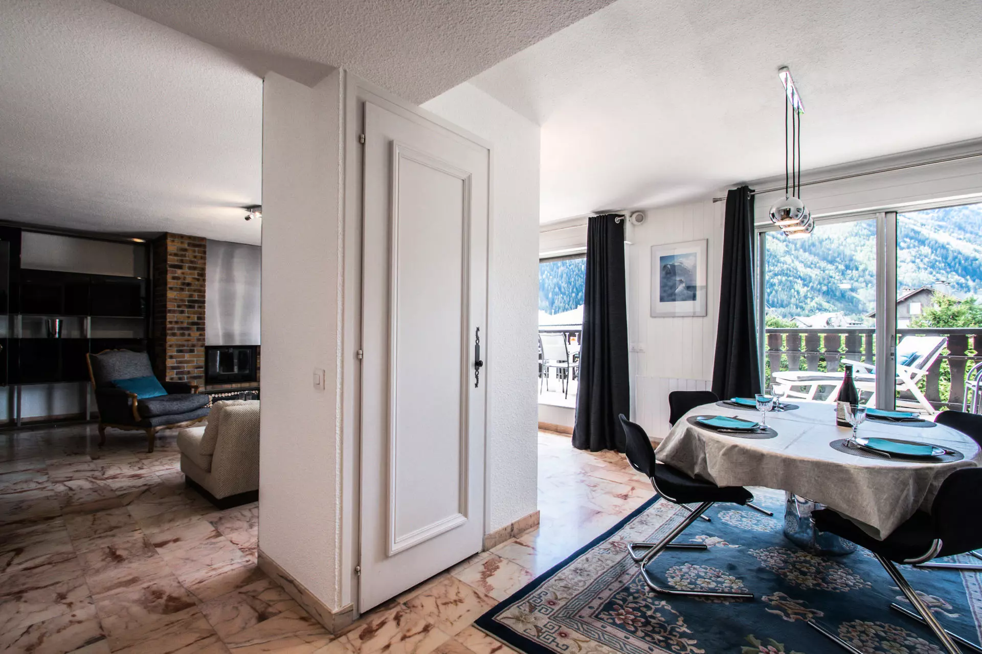 - Salon et coin repas avec accès à une grande terrasse face au Mont Blanc équipée d'un salon de jardin