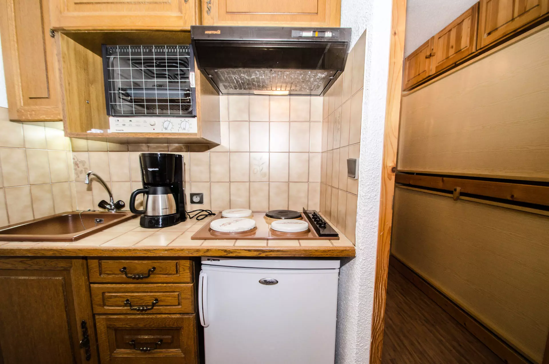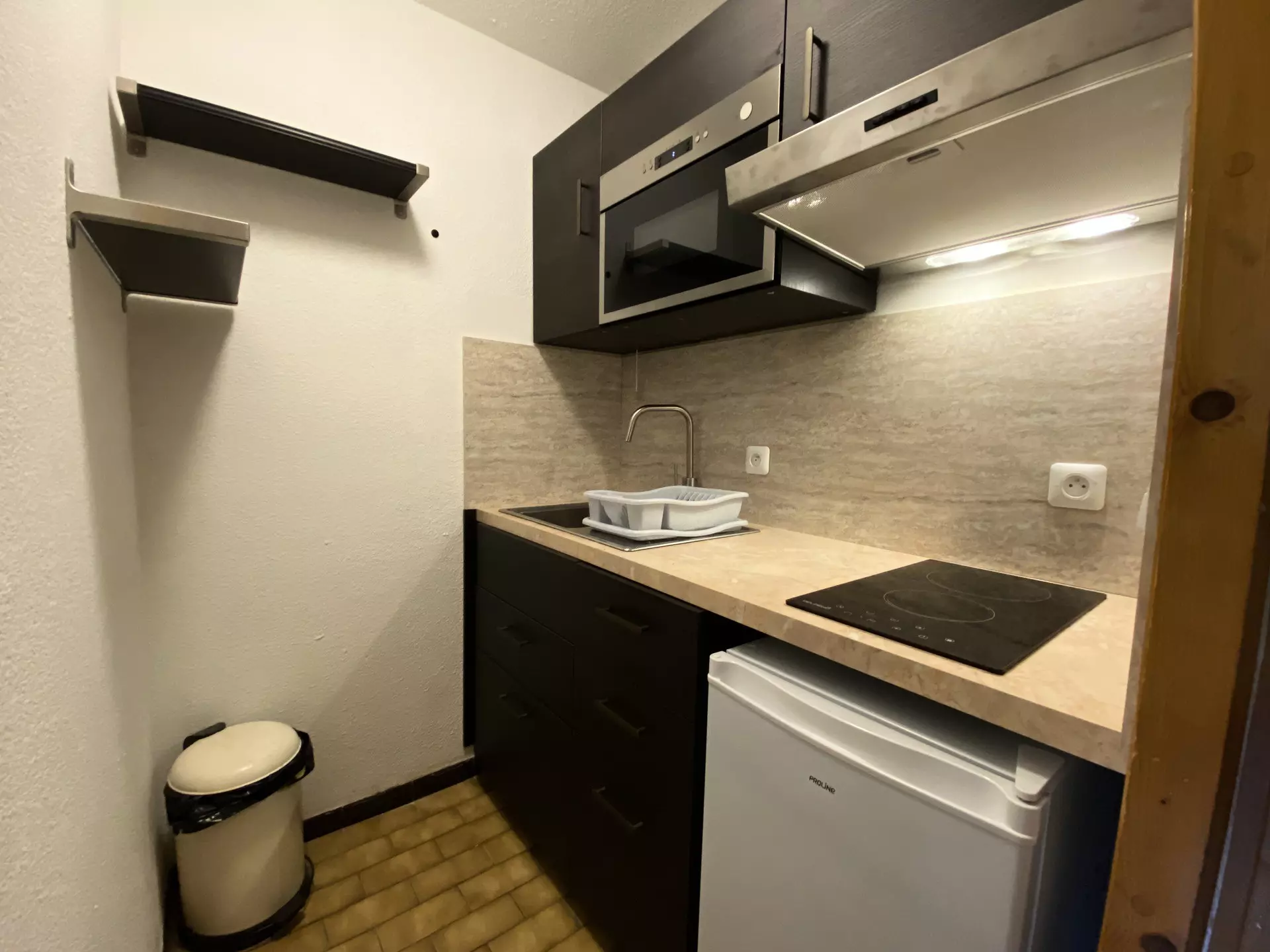 - Kitchenette équipée (plaques électriques, four combiné micro-onde + grill, hotte et réfrigérateur, cafetière filtre, grille-pain, bouilloire)