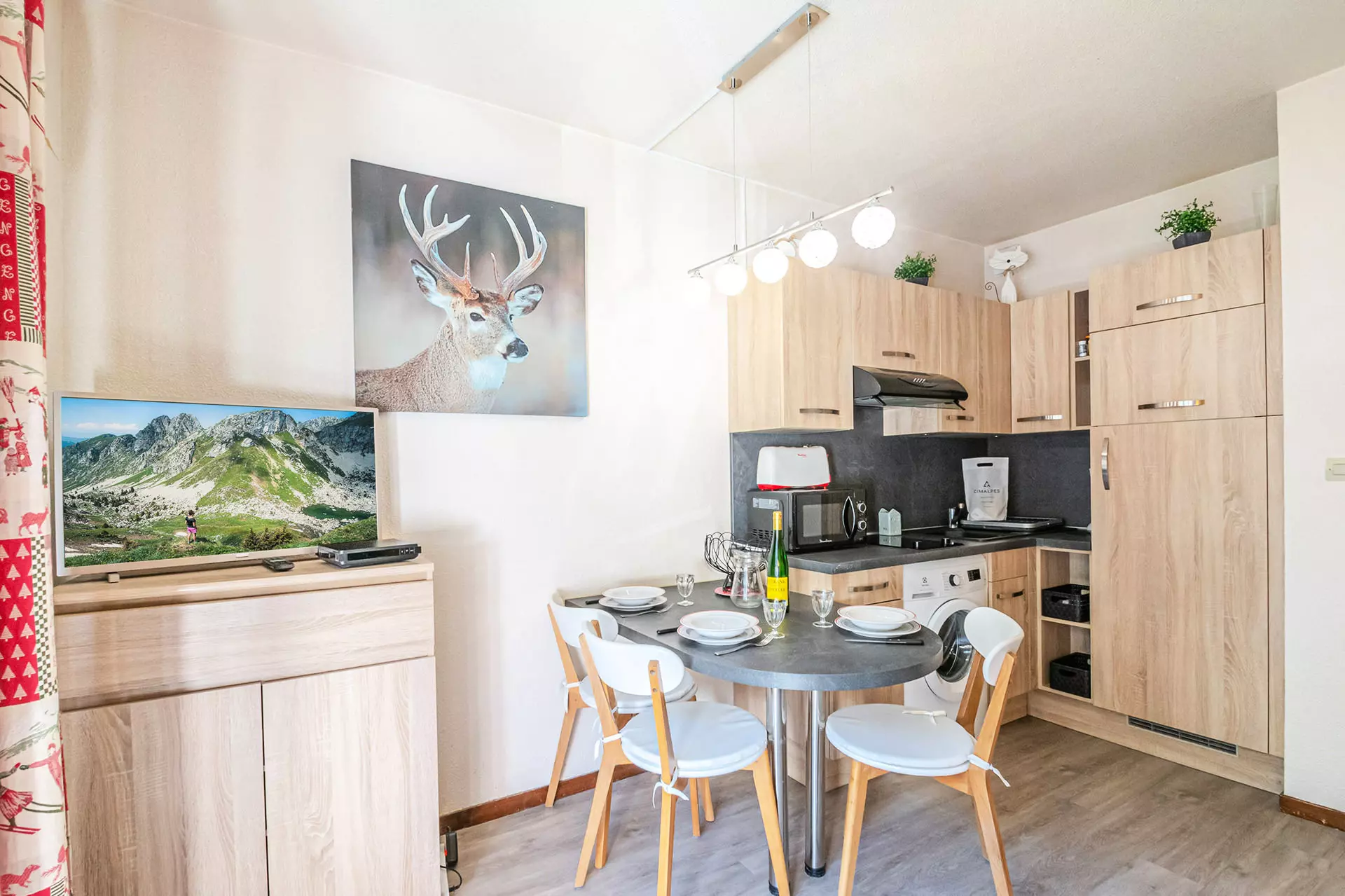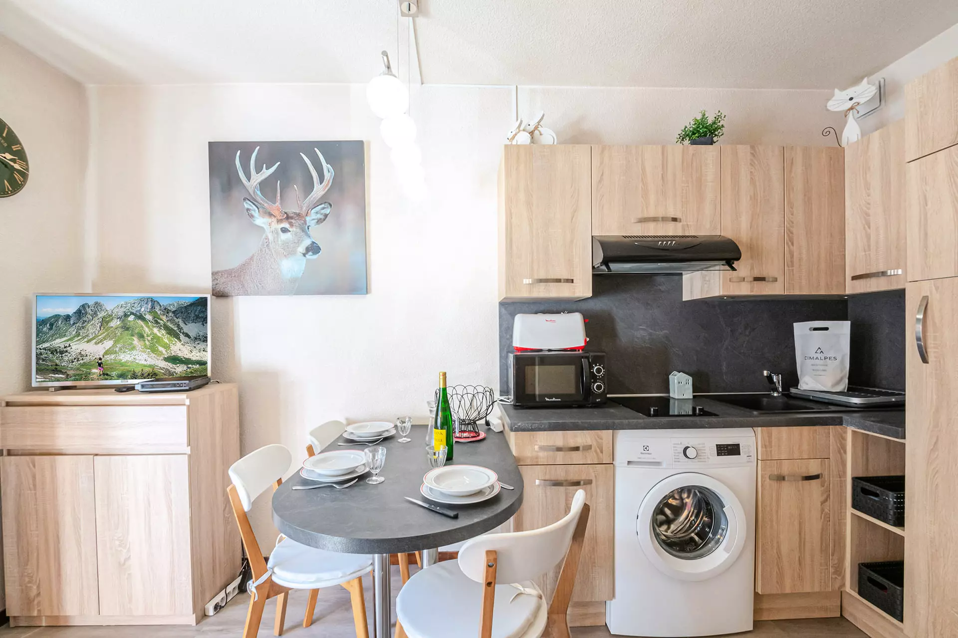 - Coin cuisine équipée (plaques vitrocéramiques, hotte, réfrigérateur, congélateur, micro-ondes, minifour et lave-linge, autocuiseur, mini appareil à raclette pour 2 personnes, batteur, grille-pain, cafetière filtre)