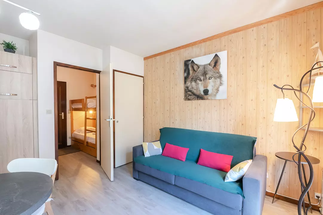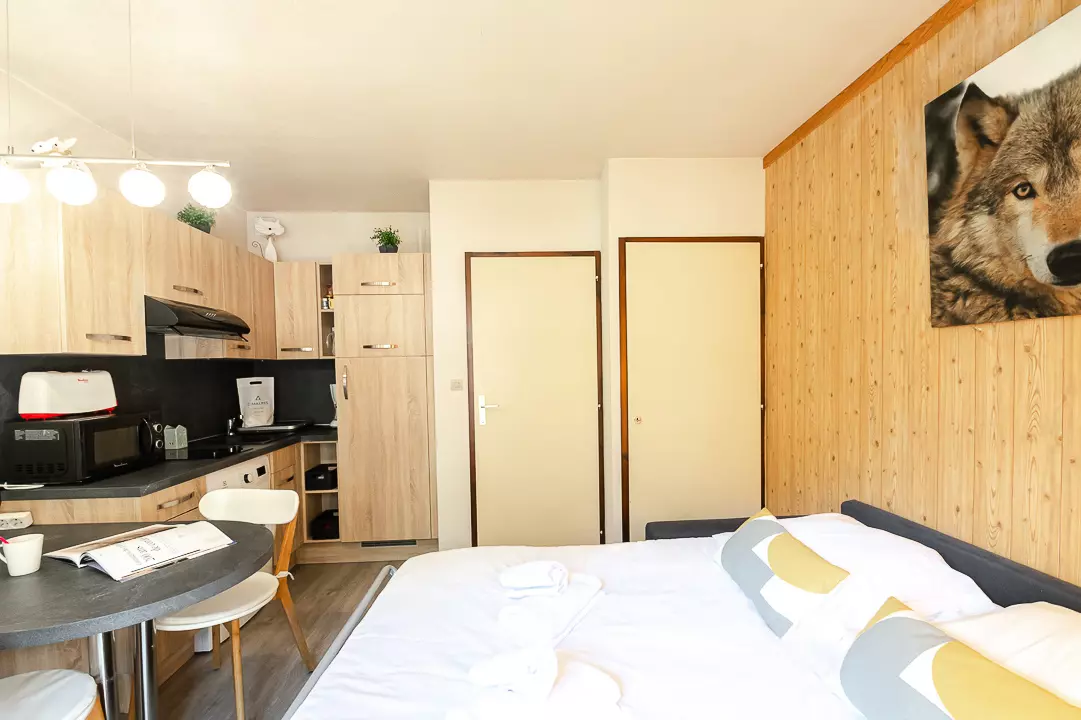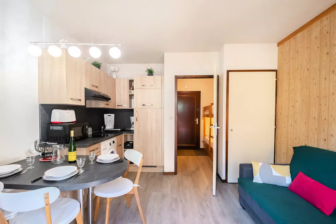 Charmant studio de 20m² pour 3 personnes, classé 2 étoiles, il est situé au 2ème étage avec ascenseur de la résidence Les Sommets, à proximité de l'Aiguille du Midi et du centre de Chamonix.