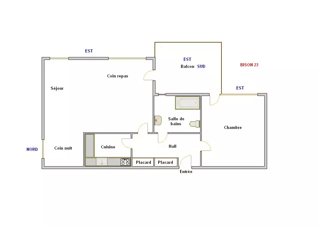 - SALLE DE BAINS (2.72 m²) : lavabo, baignoire, WC, petite fenêtre est