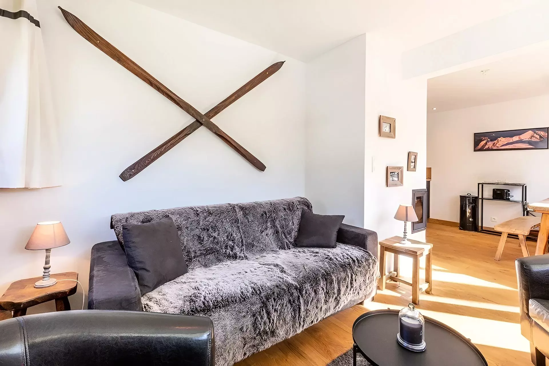 - SEJOUR (19.58 m²) : coin repas, cheminée décorative, TV écran plat, baies, porte-fenêtre sud, balcon sud ouest, vue résidences voisines / station / montagne
