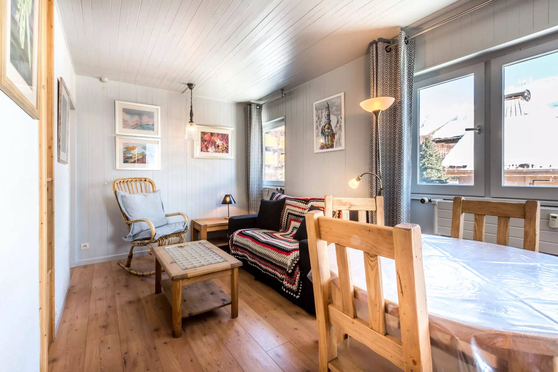 - SEJOUR (17.65 m²) et COIN MONTAGNE : 2 LITS SUPERPOSES (80) -> lit supérieur interdit -6 ans, fenêtre nord, vue route de la Piscine, COIN REPAS : TV écran plat, lecteur DVD, fenêtres est, porte-vitrée sud, balcon sud est, vue station / montagne