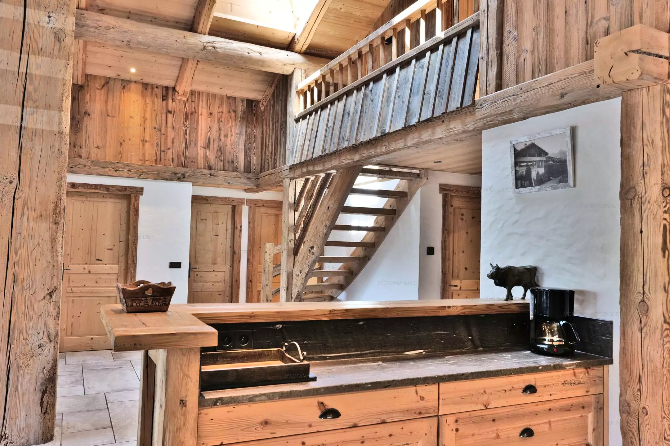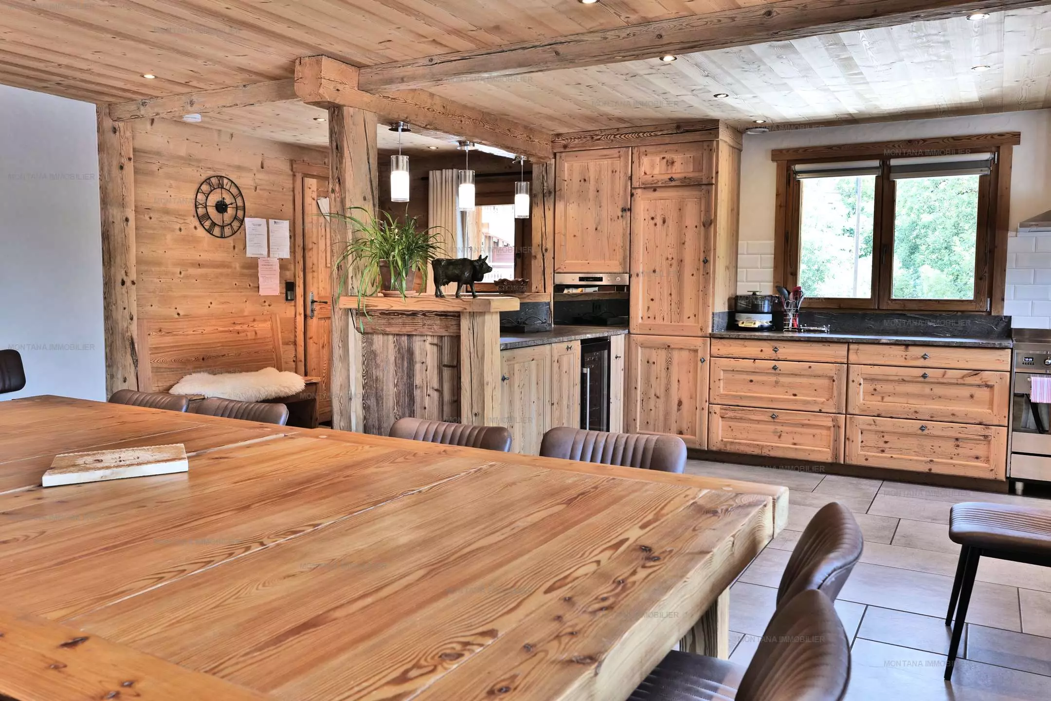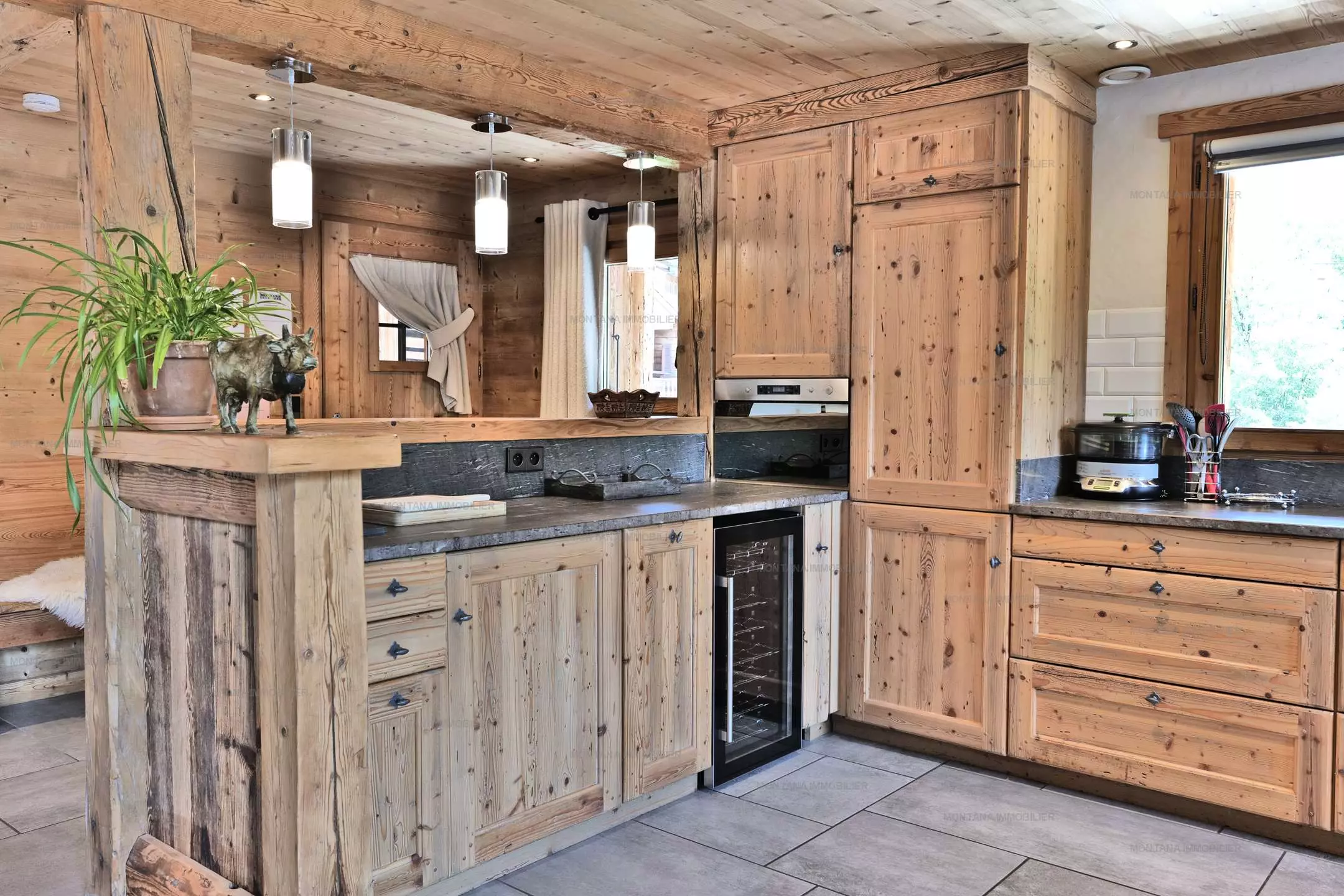 Une cuisine ouverte sur séjour avec poêle à bois