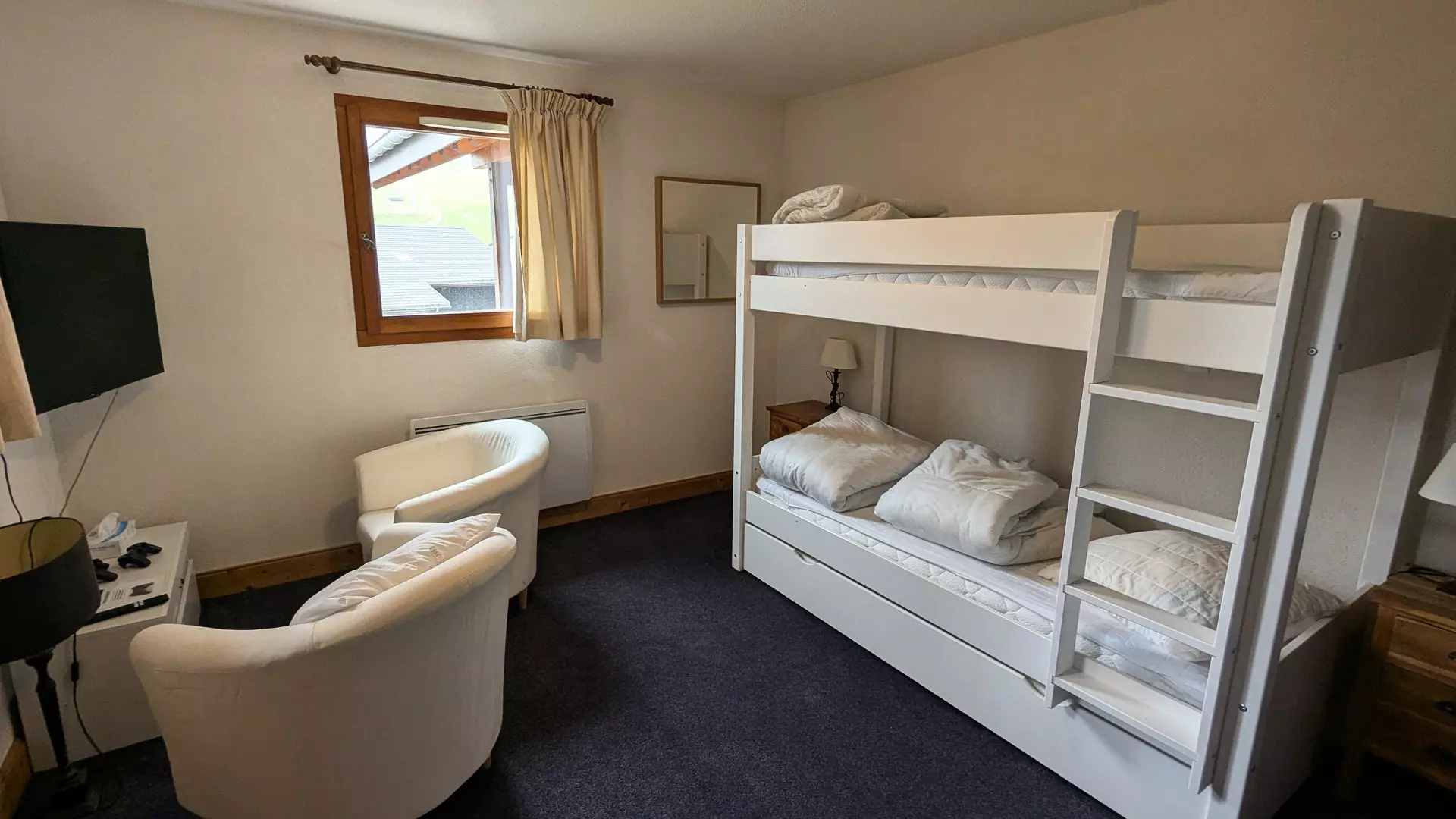 Couchages : 1 lit superposé en 90 X190 cm (veuillez noter que le couchage en hauteur ne convient pas aux enfants de moins de 6 ans)