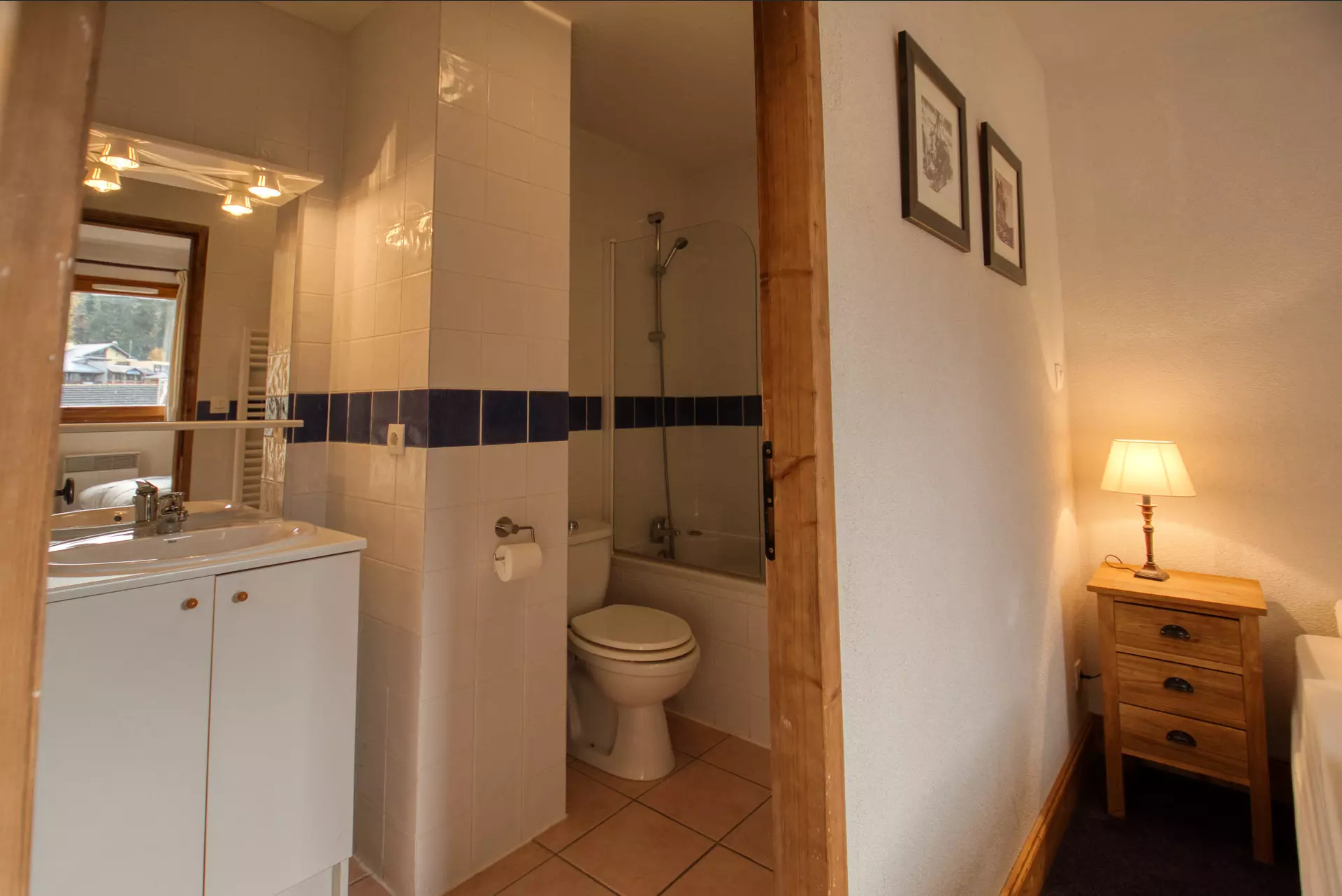 À l'étage, vous découvrirez une deuxième chambre en suite avec salle de bain (baignoire et toilettes), une troisième chambre avec tv en suite avec salle de bain. De plus, un WC séparé est disponible pour plus de commodité.