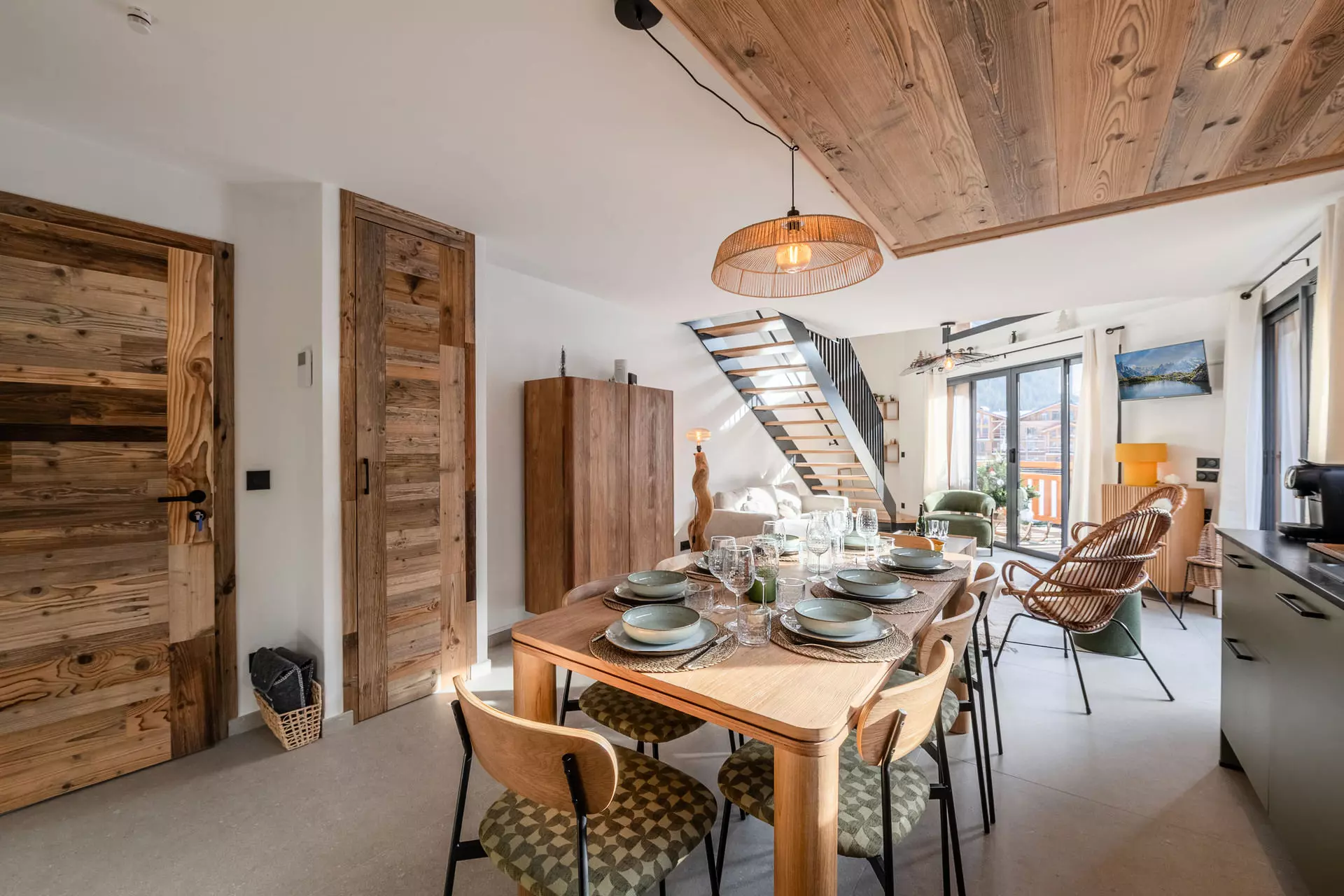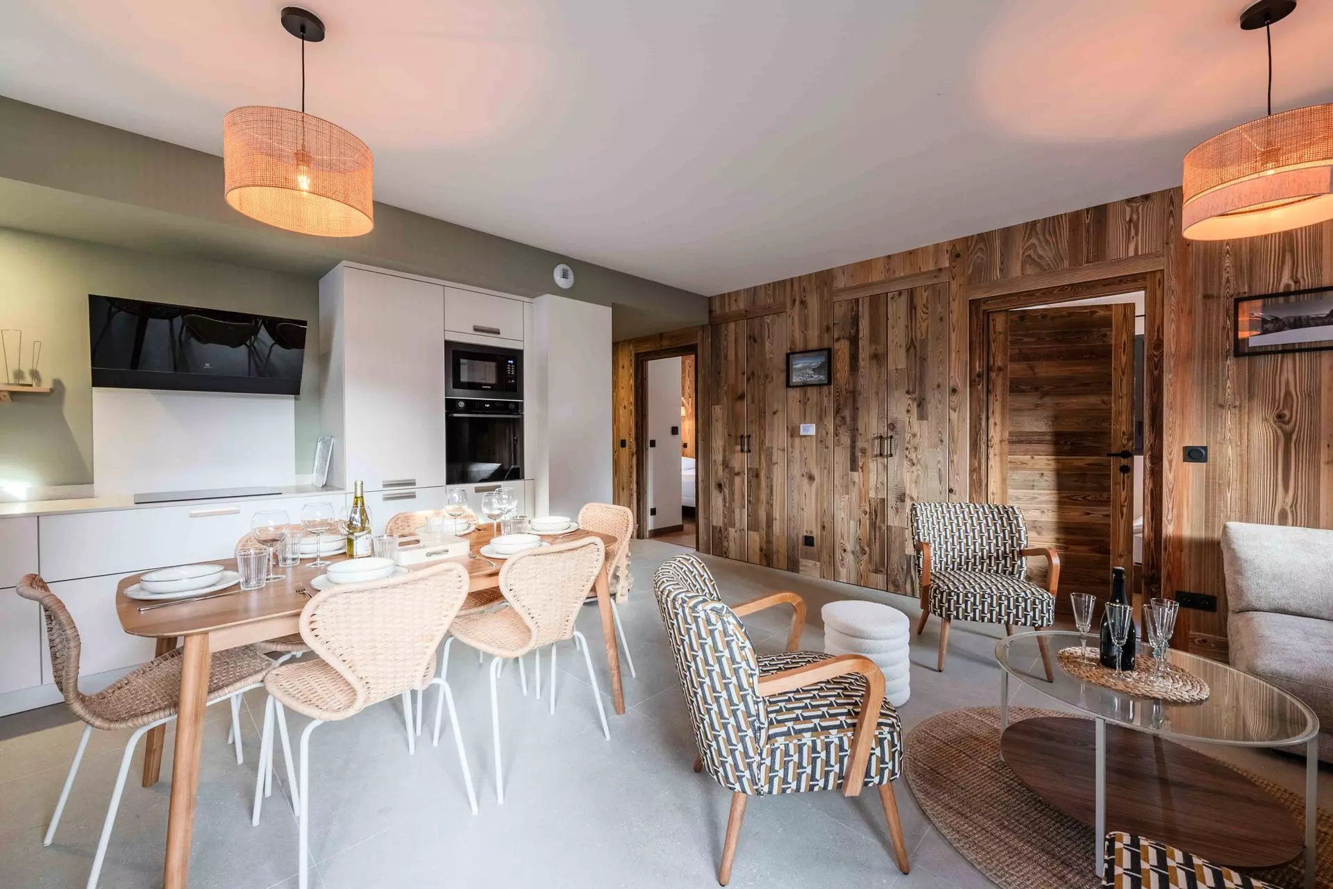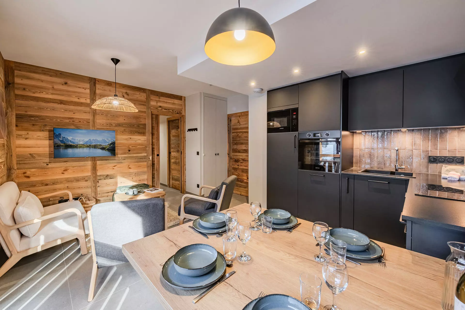 - Cuisine ouverte entièrement équipée (grille-pain, bouilloire, cafetière à filtre et cafetière Nespresso, plaques inductions, four, micro-onde, lave vaisselles) avec espace repas et accès balcon