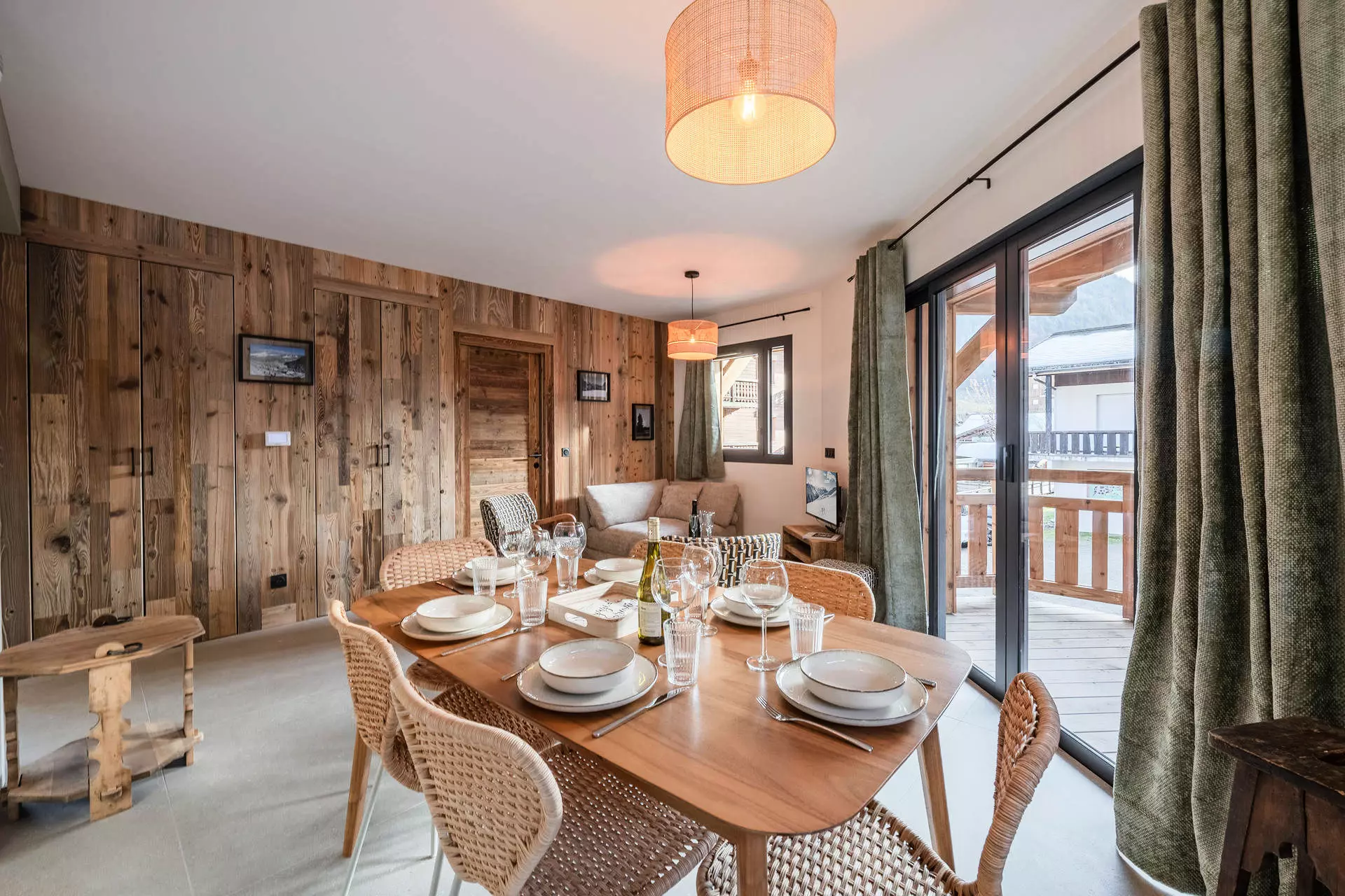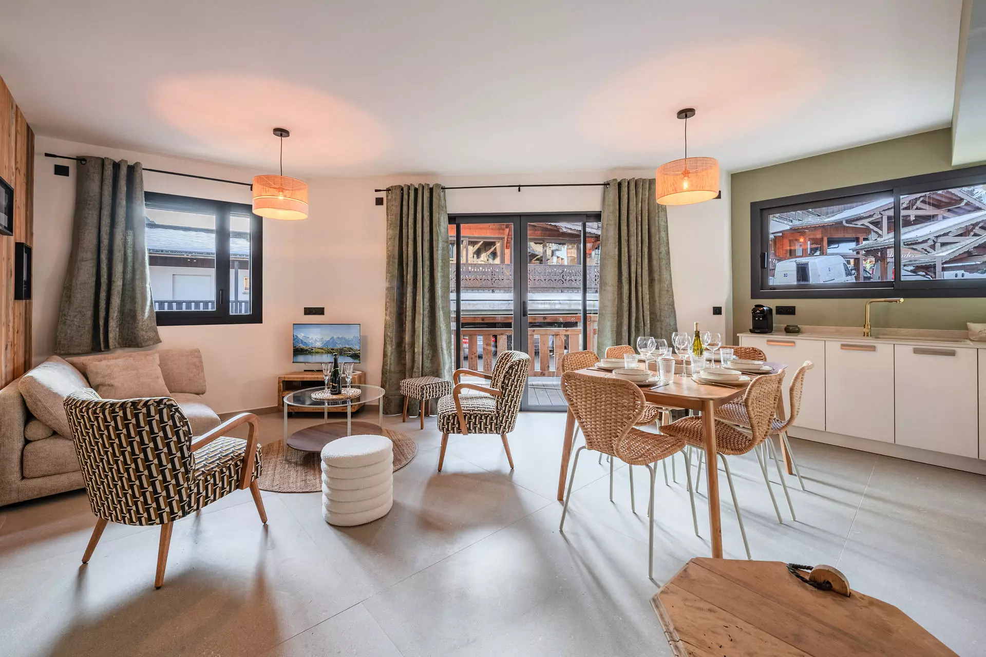 - Séjour comprenant un canapé, un ensemble de fauteuils modernes et une TV avec accès balcon/terrasse