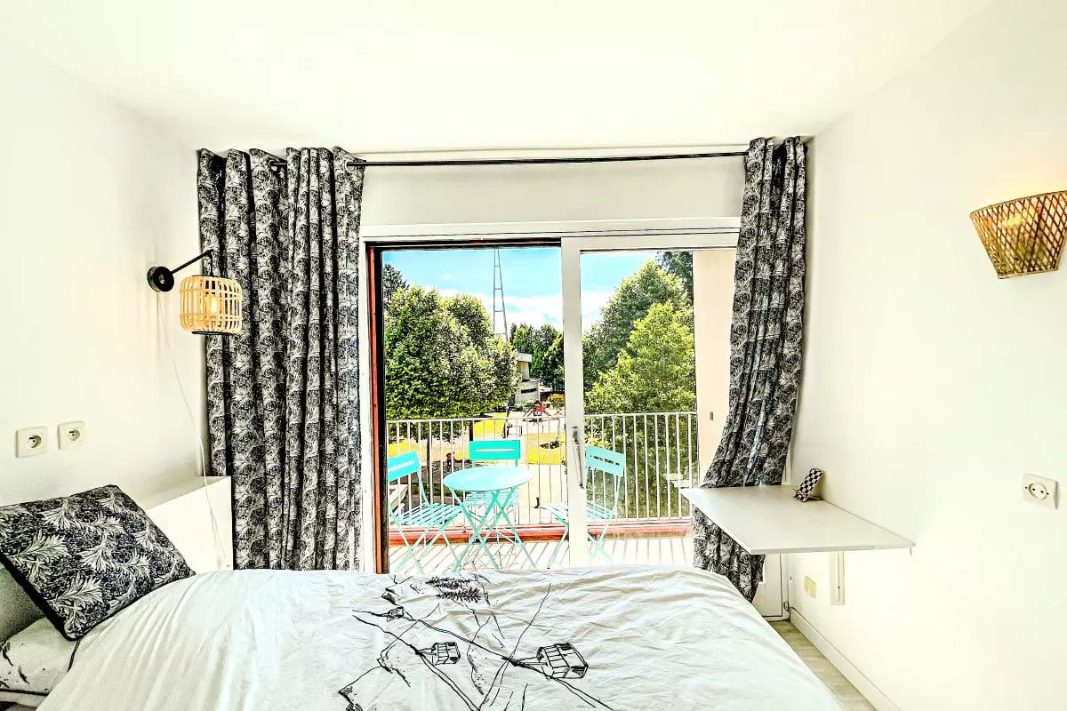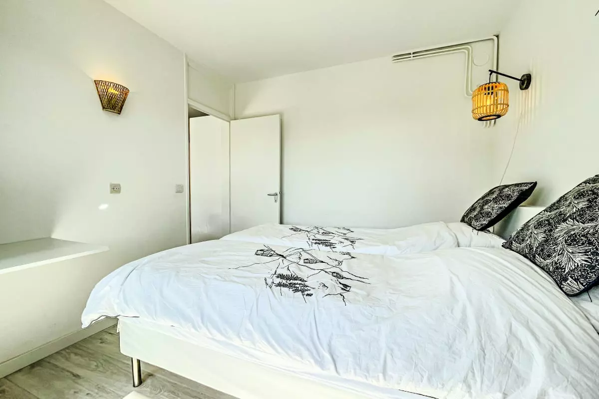 L'appartement est localisé au 2ᵉ étage avec ascenseur d'une grande résidence. Il s'ouvre sur un hall avec accès sur la salle de bain et les toilettes, puis à droite la cuisine équipée ouverte sur le salon. Cet espace est lumineux et dispose d'une grande baie vitrée avec accès au balcon. La chambre est également aménagée de 2 lits simples collés et de son propre balcon.