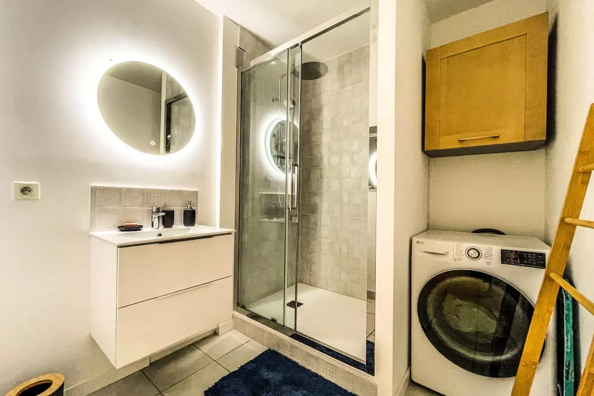Climatisation, Wi-Fi, Télévision, Ventilateur rafraîchissant, Machine à café Nespresso, Four, micro-ondes, Réfrigérateur, Lave-vaisselle, Lave-linge-séchant, Sèche-cheveux, Planche et Fer à repasser, Aspirateur, chauffage au sol collectif (pas de réglage possible).