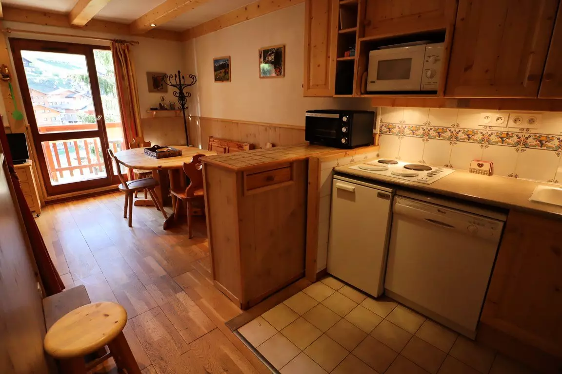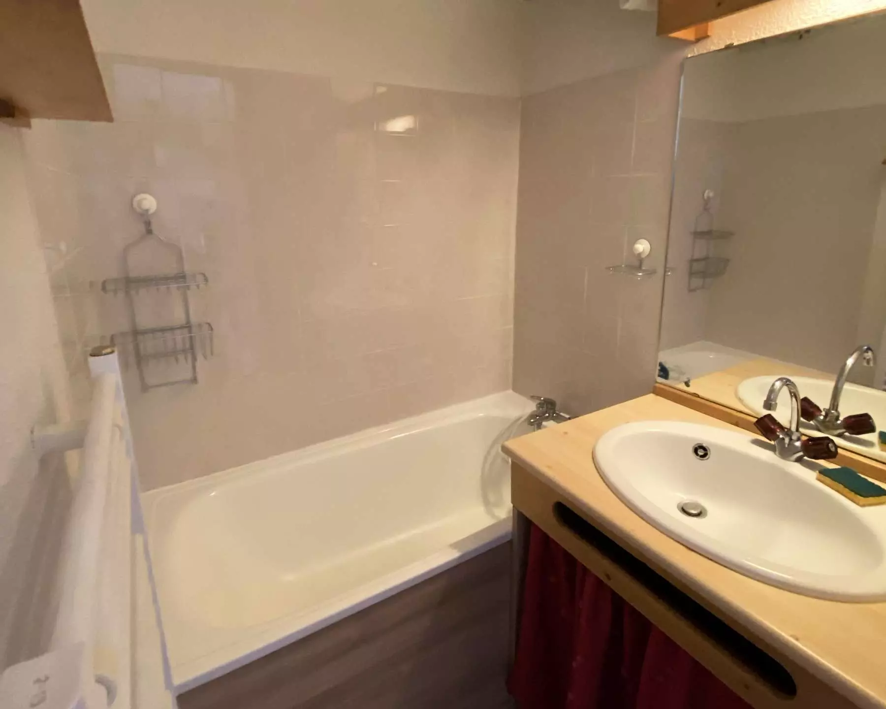 L'entrée débottoir, permet d'accéder à un séjour avec cuisine bien équipée (lave-vaisselle et lave linge - four électrique et four micro ondes - appareils à raclette et fondue). L'espace très bien délimité laisse une large place au salon (clic clac permettant un couchage de 2 pers.160). Cette pièce ouvre sur un balcon Est permettant de bénéficier d'une jolie vue sur le village, la montagne et l'été, de garder un oeil sur la piscine*.