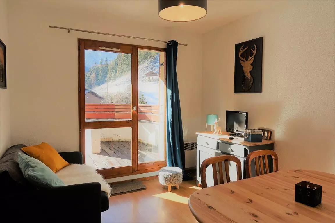 Entrée cabine avec lits superposés - séjour avec convertible 140 - TV - kitchenette équipée (lv) - Chambrette avec 1 convertible 140 - grand balcon ouest - vue dégagée sur les sommets environnants.