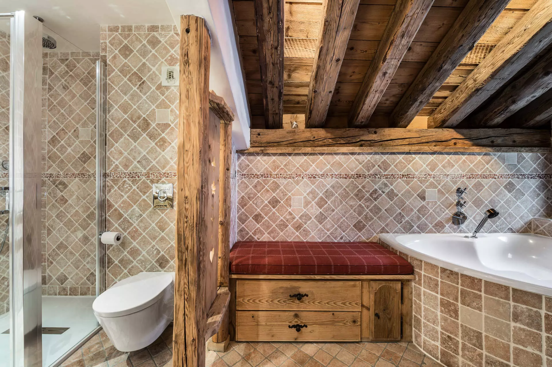 Chalet des Trois Soeurs, airs traditionnel avec charpente apparente et beau lustre en bois dans la résidence du domaine de Bellecôte. Service petit déjeuner inclus, salles de détente et salle cinéma pour le bien-être de ces 10 occupants.