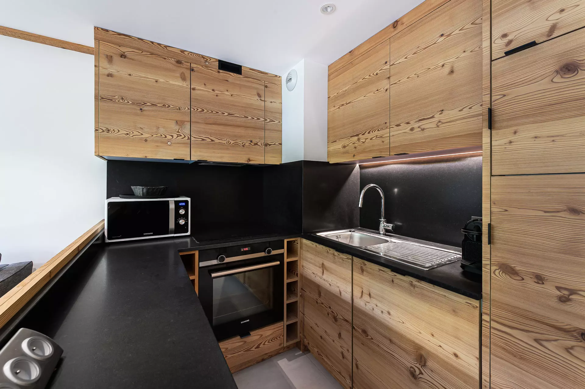 - Cuisine ouverte : 4 plaques électriques, réfrigérateur, four, micro-ondes, lave-vaisselle