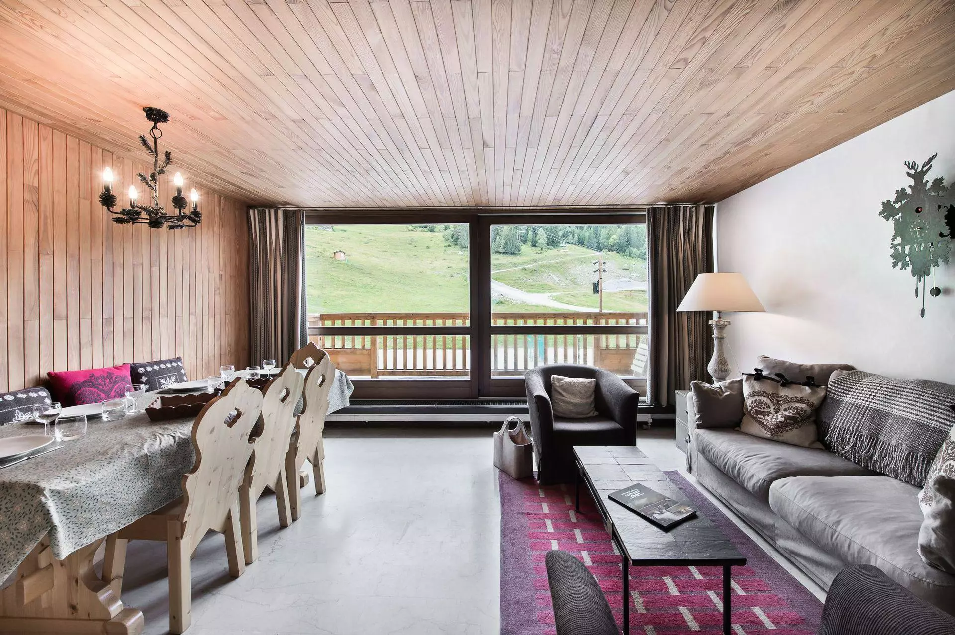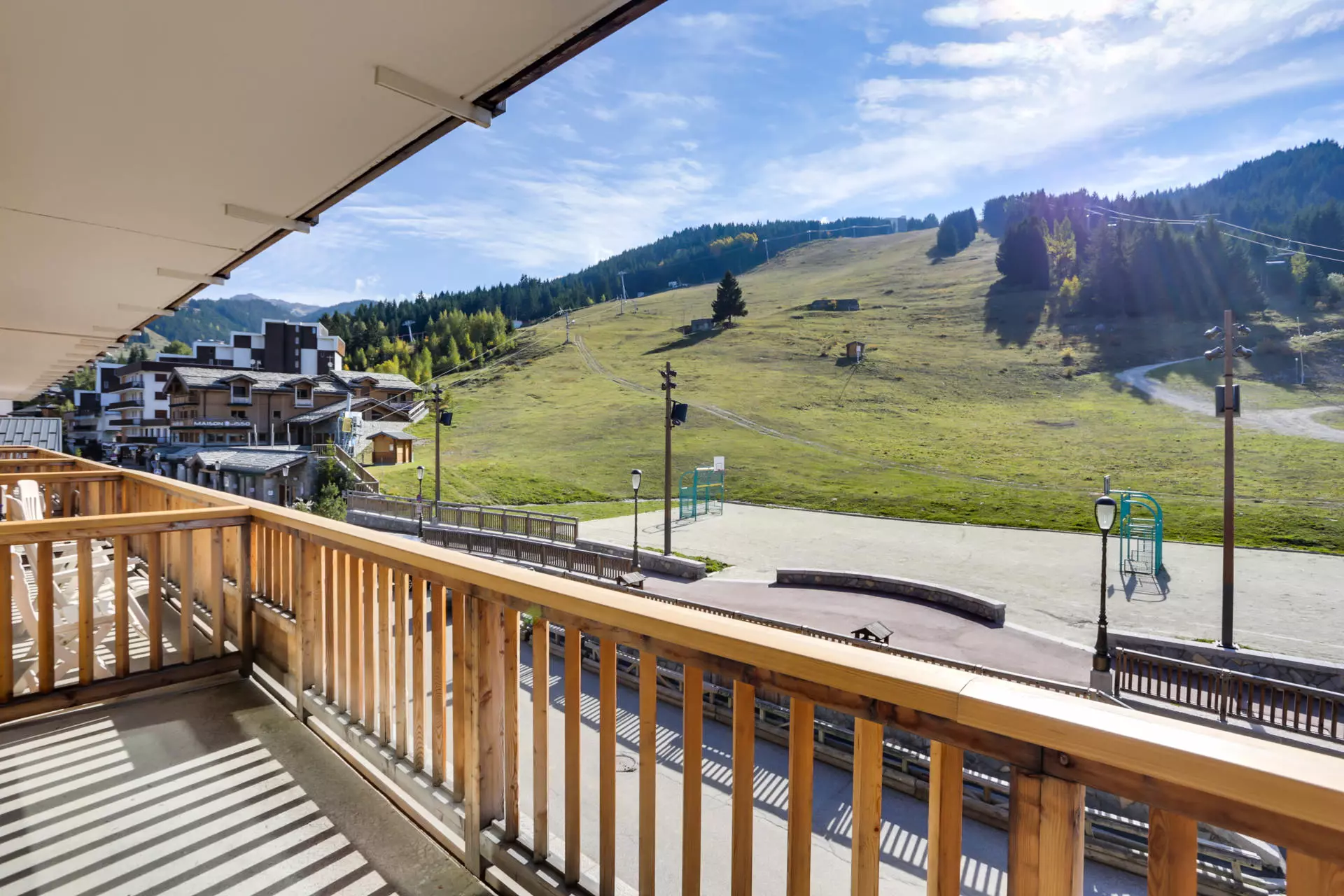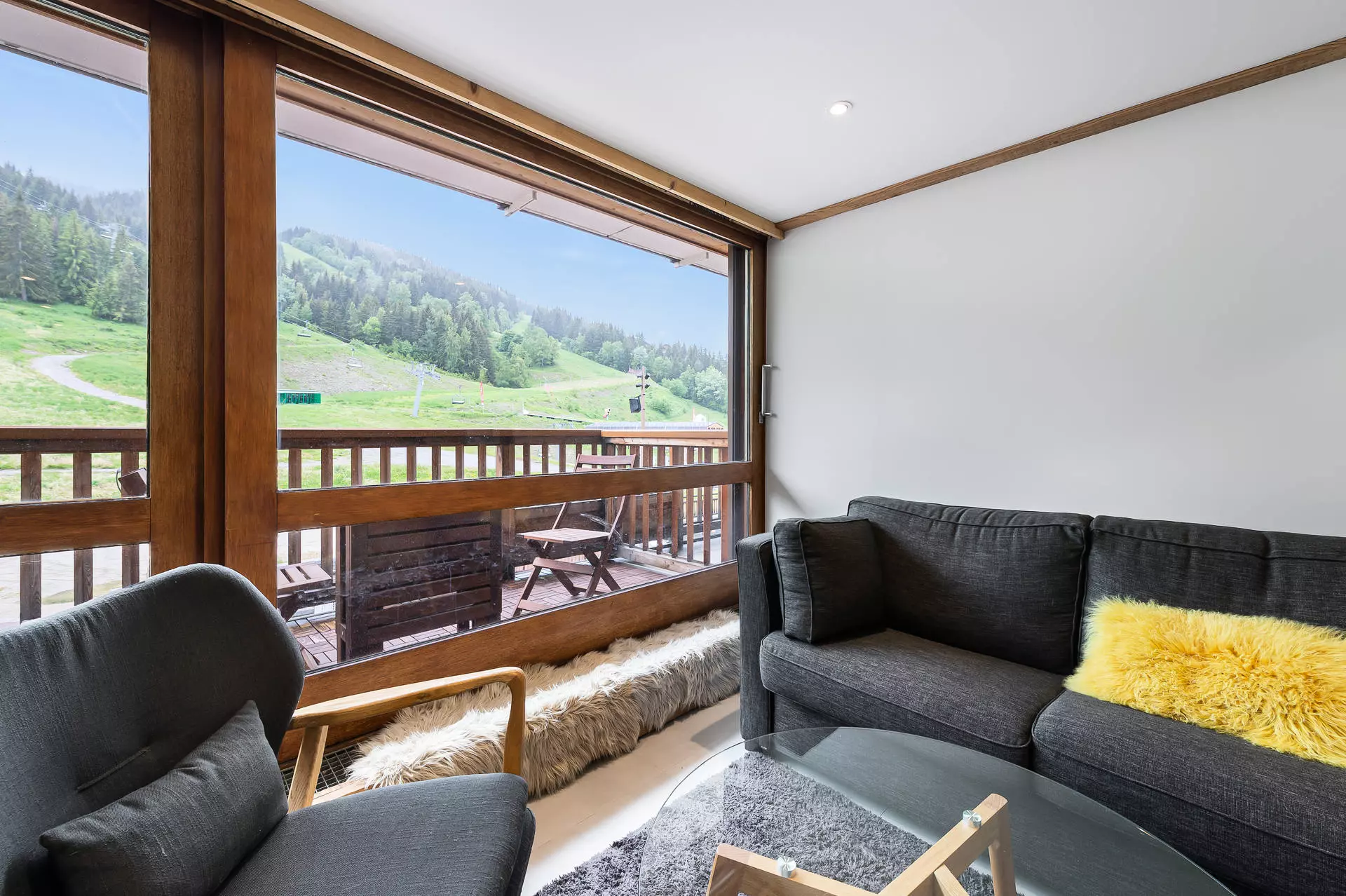 Superbe vue sur le domaine skiable et les sommets. Grande terrasse de 10m² face aux pistes et aux télésièges. Grande baie vitrée avec double vitrage.