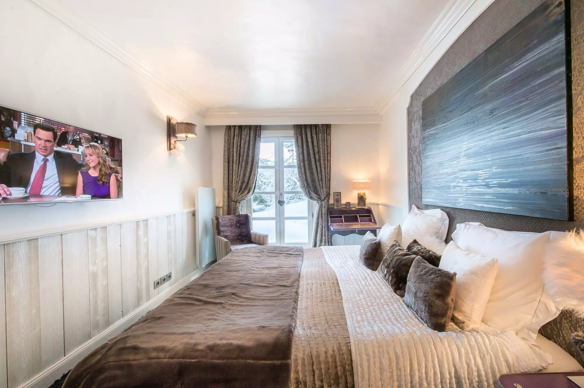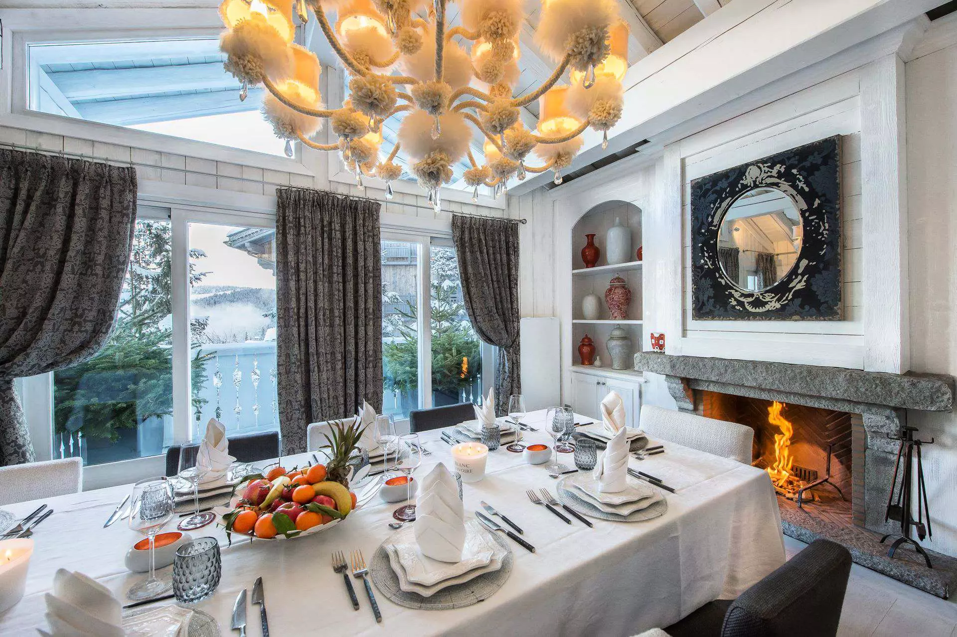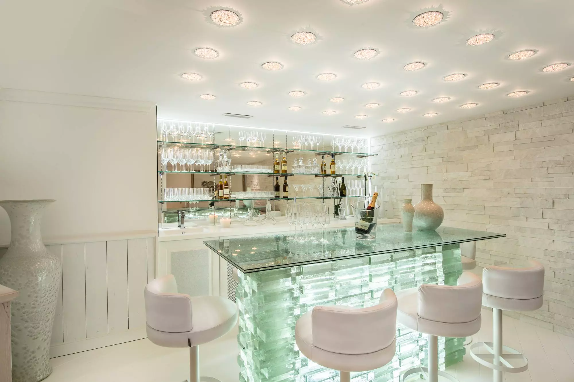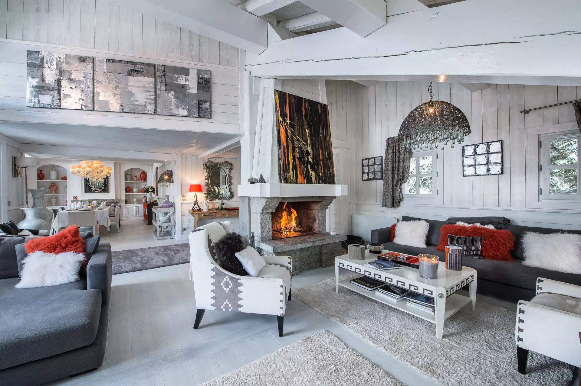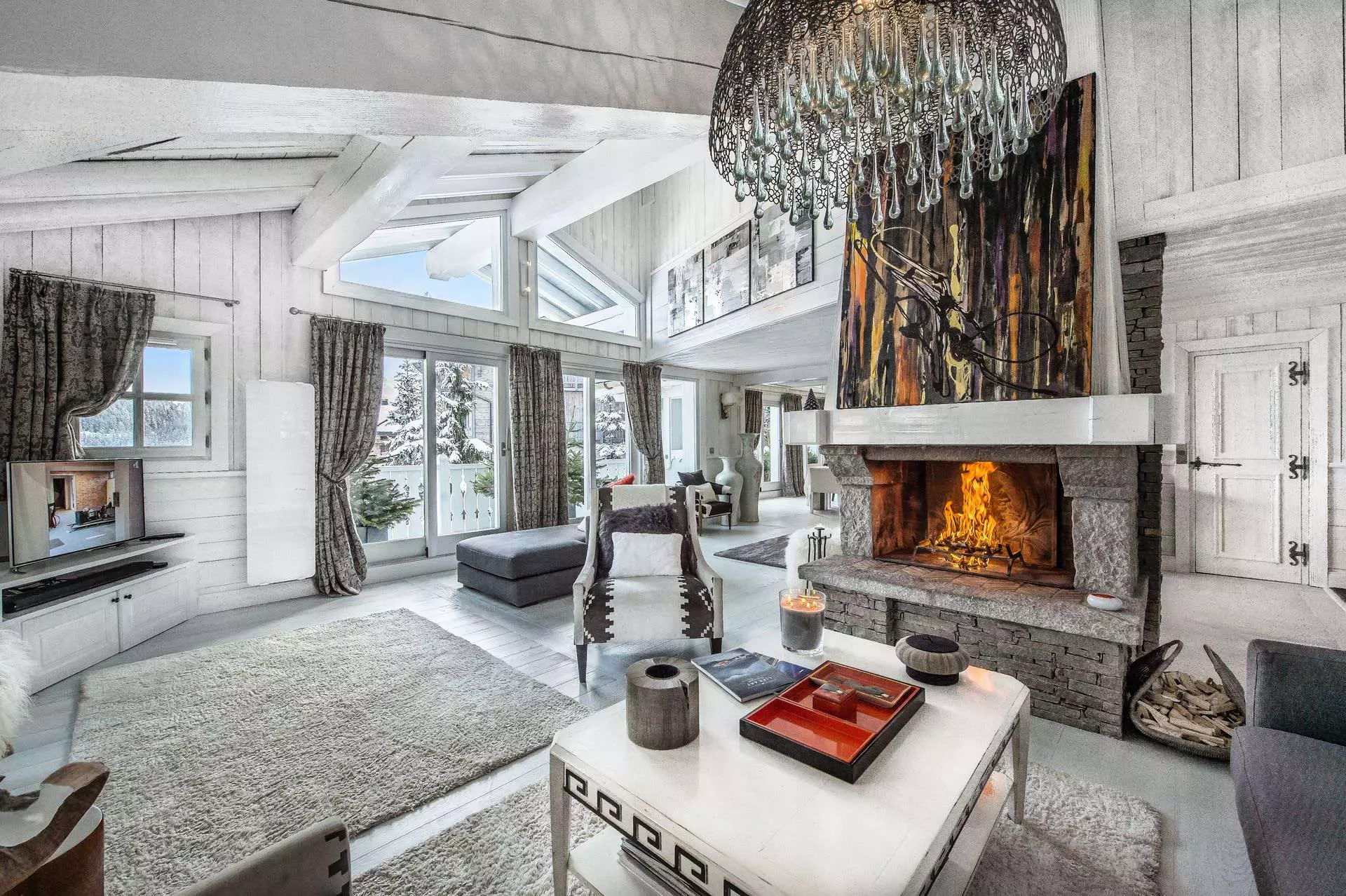 Chalet d'exception de 450m², monochrome blanc, avec 6 chambres comprennant lit double et salle de bain attenante. Nombreux espaces détente et loisirs; bar, home cinema, hammam, bains à remous intérieur, piscine, salle de sport et de massage. Service petit déjeuner préparé par un chef.
