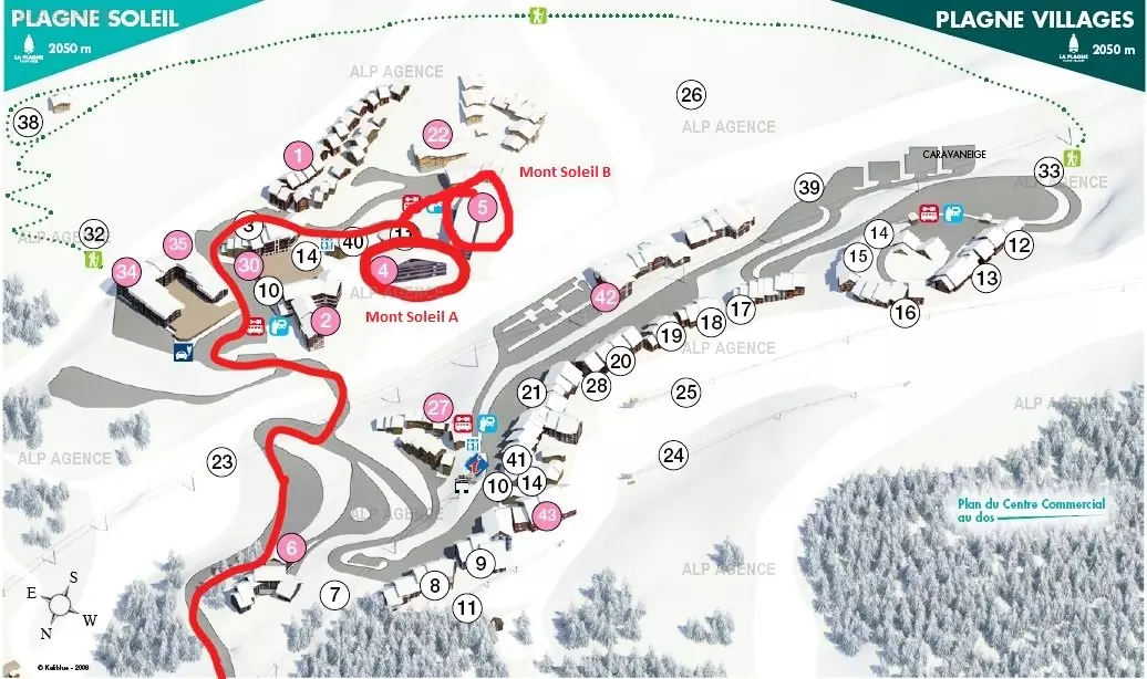 La Résidence : AU PIED DES PISTES, à proximité des commerces et de l'Ecole de ski - Plagne Soleil est reliée à Plagne Villages / Centre par navettes en bus ou télécabine.