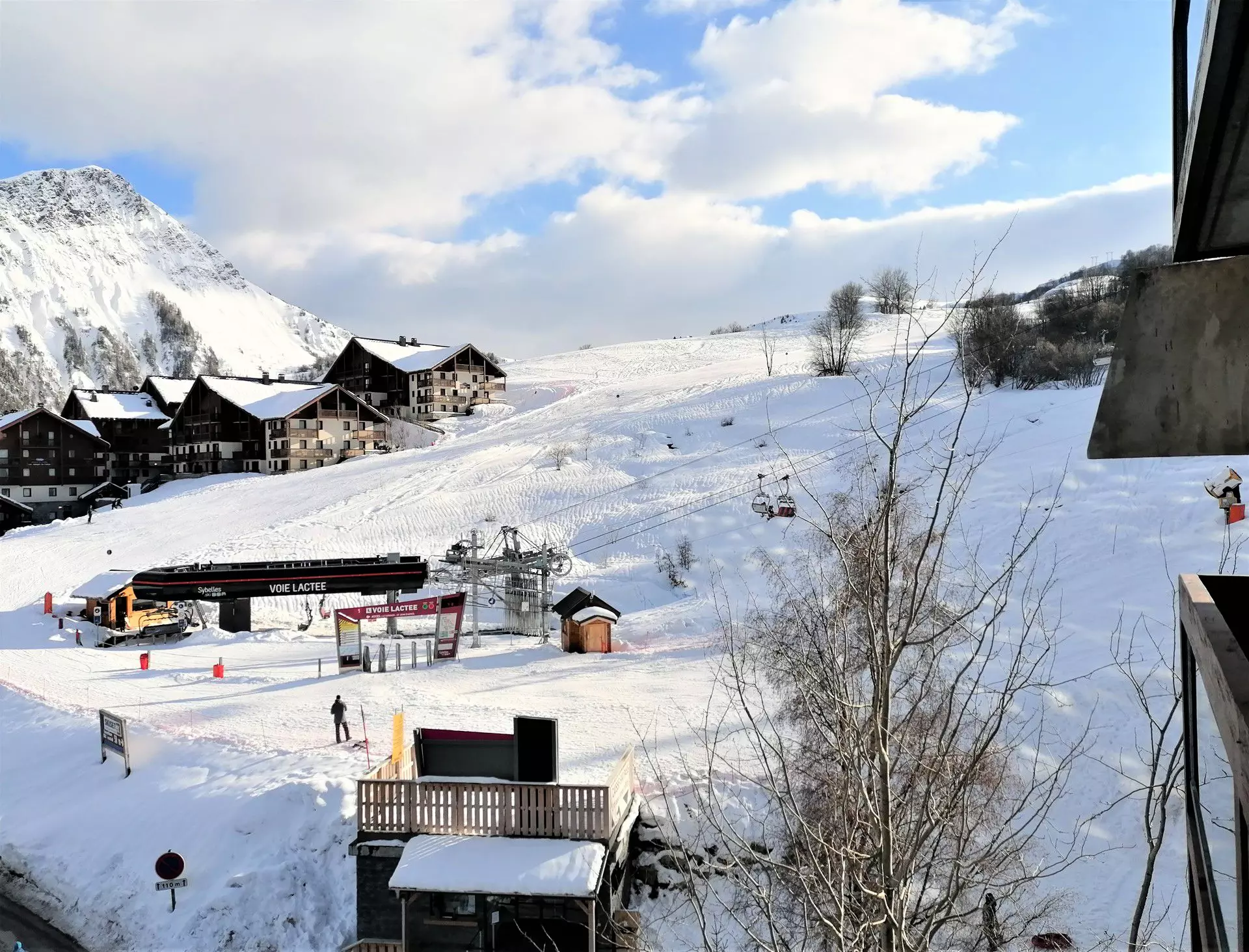 Joli Studio de 28m², pour 4 adultes et un enfant, Résidence Lunik, au 3 ème étage, Balcon exposé sud, vue pistes et Télésiège La Voie Lactée au bas de l'immeuble.