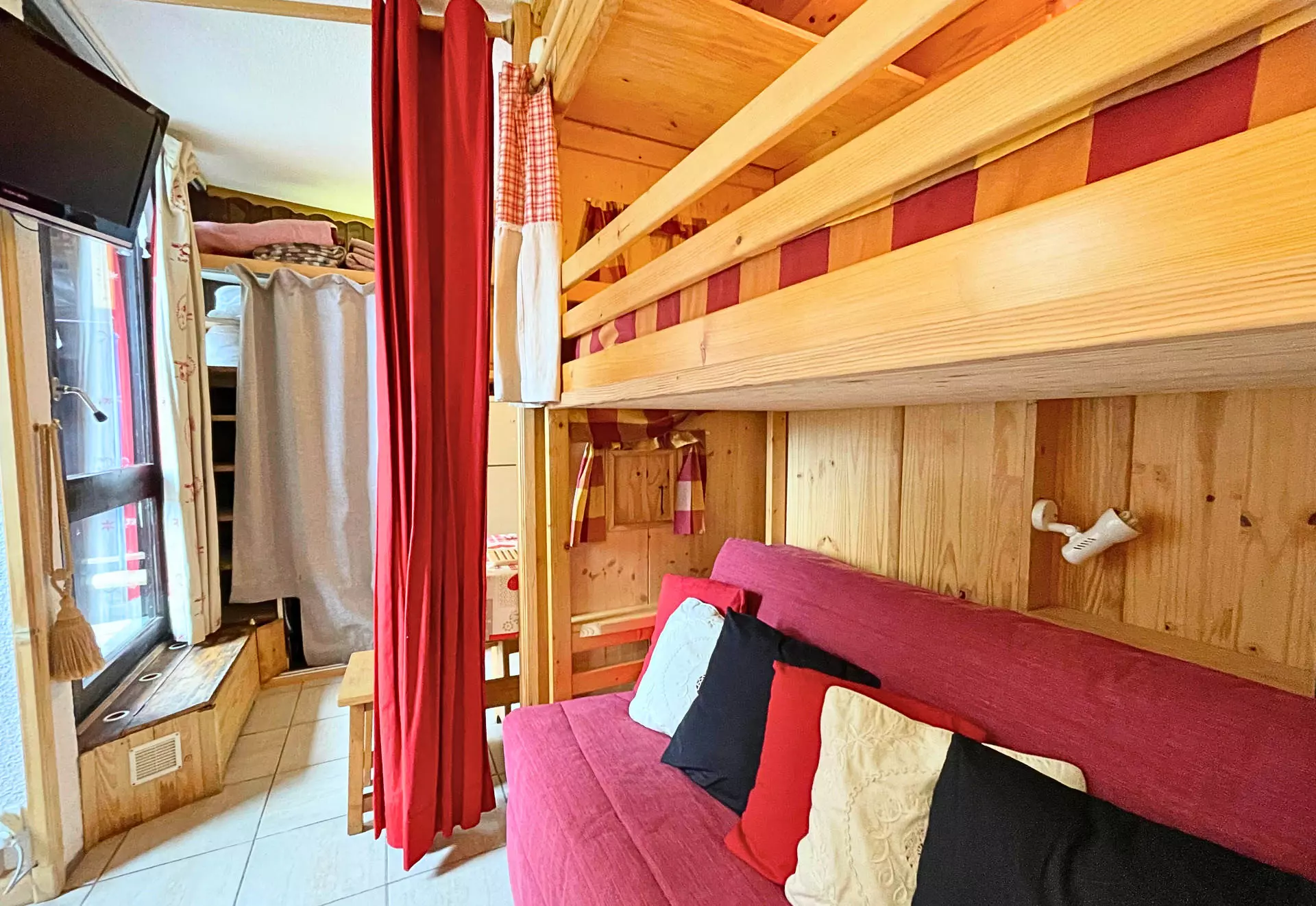 Séjour : 1 banquette lit simple, 1 lit gigogne, 1 lits superposés (2x80cm) pouvant être séparés par une cloison mobile, télévison