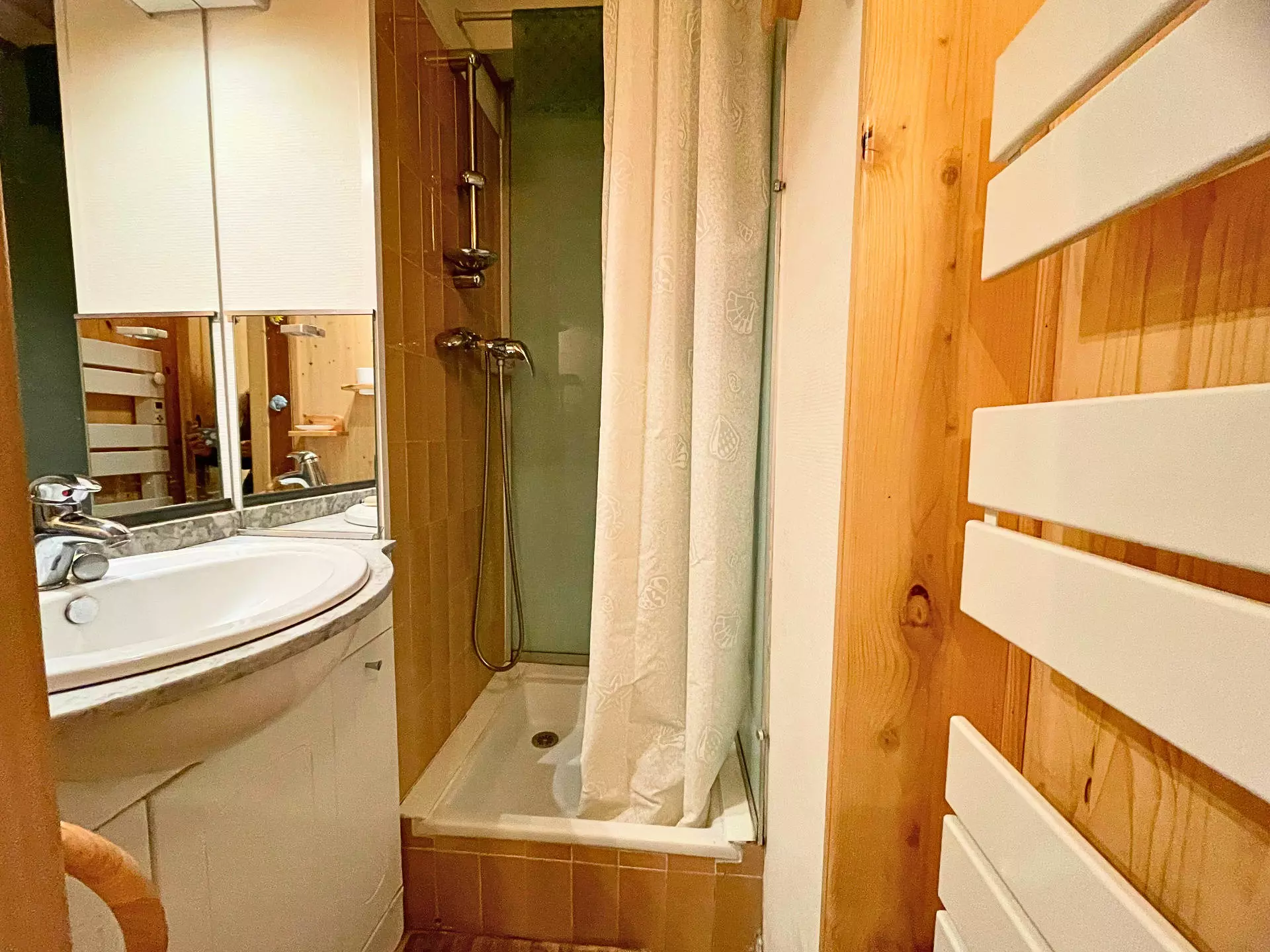Salle de bains : lavabo, douche, sèche-serviettes, toilettes