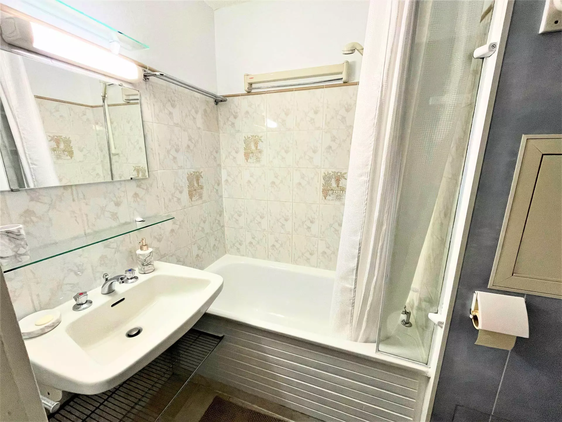 Salle de bains : lavabo, baignoire, sèche-serviettes, toilettes, lave-linge 3kg, sèche-cheveux