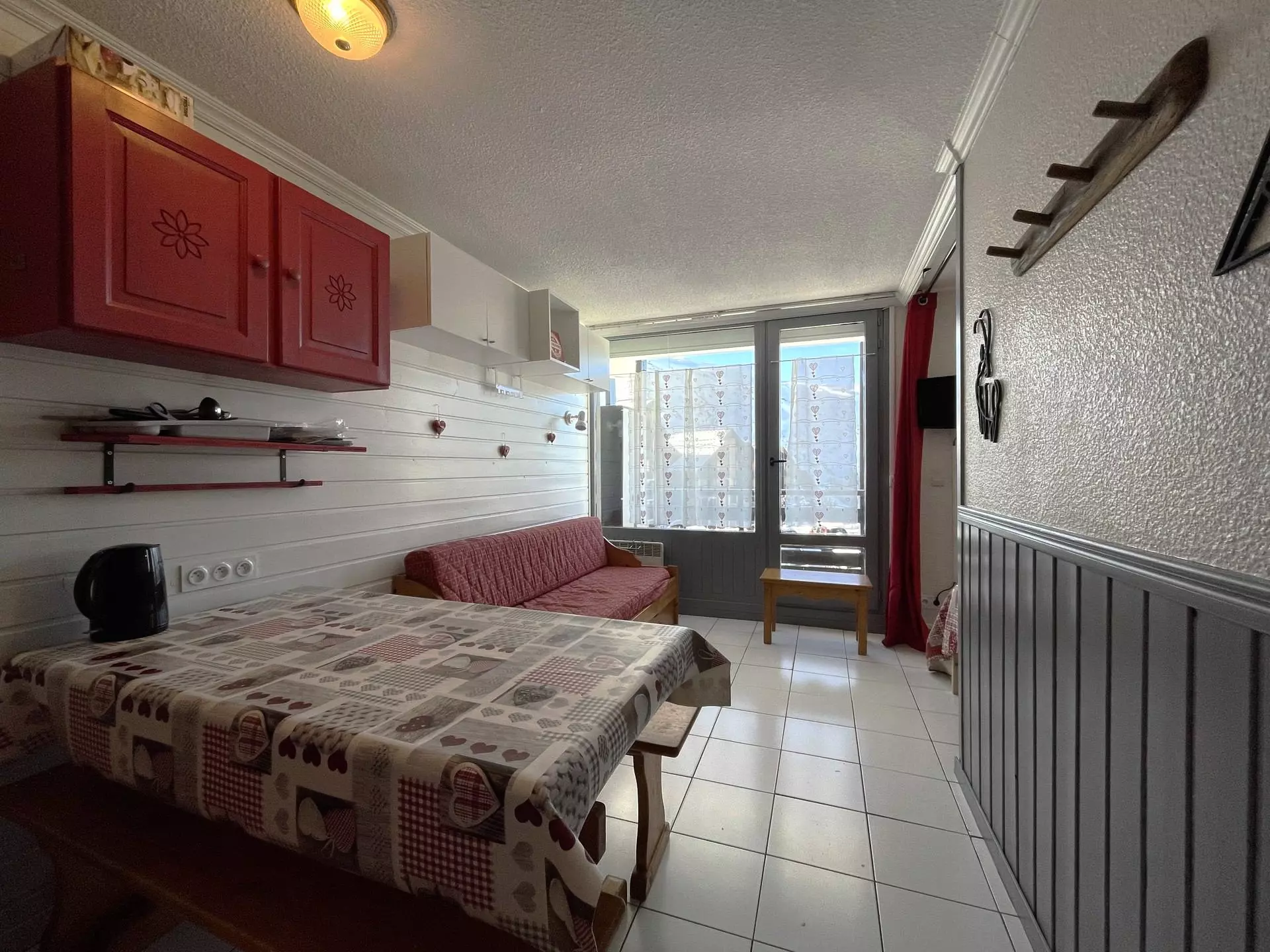 Résidence Le Villaret (N°106), studio divisible cabine pour 4 personnes 26m², au 1er étage par ascenseur au niveau des casiers à skis et de l'accès aux pistes (accès au parking exterieur rez de chaussé par ascenseur), balcon exposé Ouest, vue sur la montagne.