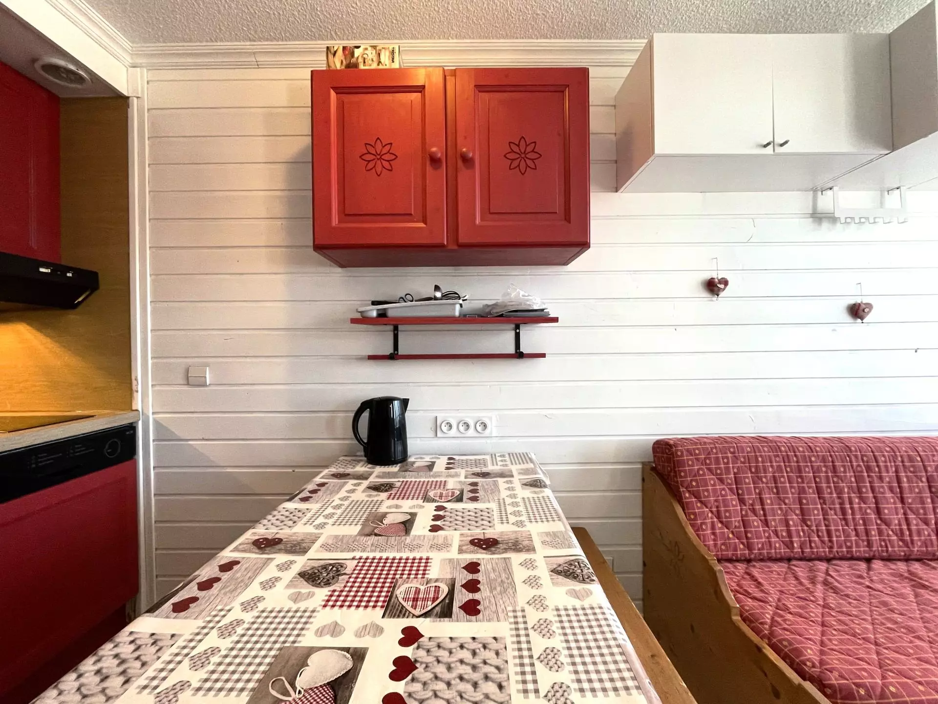 Cuisine équipée ouverte sur séjour : plaques électriques (x2), four, micro-ondes, réfrigérateur avec bac à glaçon 5L, lave-vaisselle, cafetière Philips Senseo à dosette et cafetière à filtre, bouilloire, grille-pain, appareil à fondue, appareil à raclette, appareil à croque-monsieur