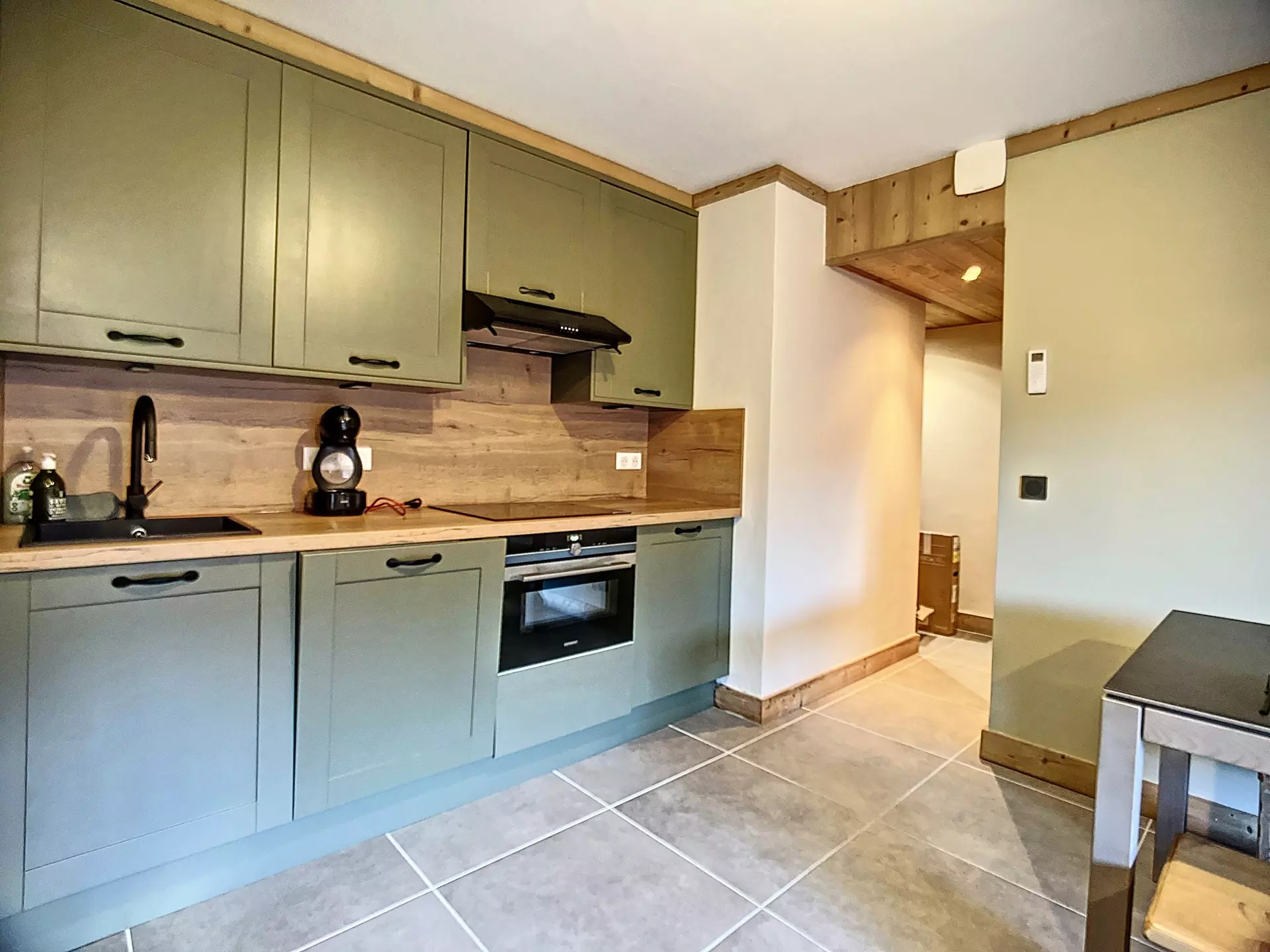 Cuisine équipée : plaque vitrocéramique, hotte, four traditionnel, micro-ondes, lave-vaisselle, cafetière Dolce Gusto Nescafé