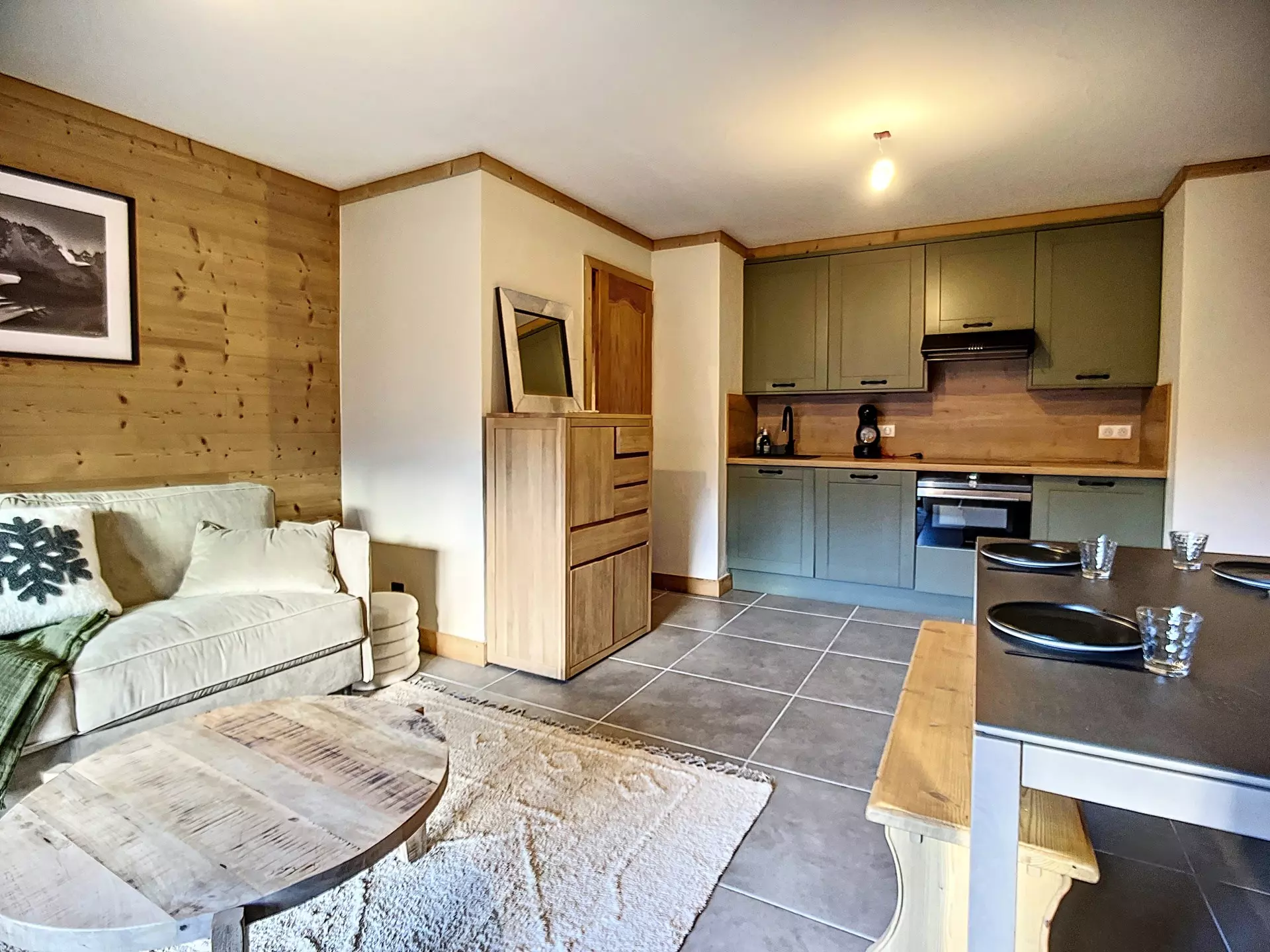 Grande pièce à vivre avec cuisine, table à manger et coin salon avec canapé-lit convertible (160 x 190 cm) pour 2 couchages supplémentaires