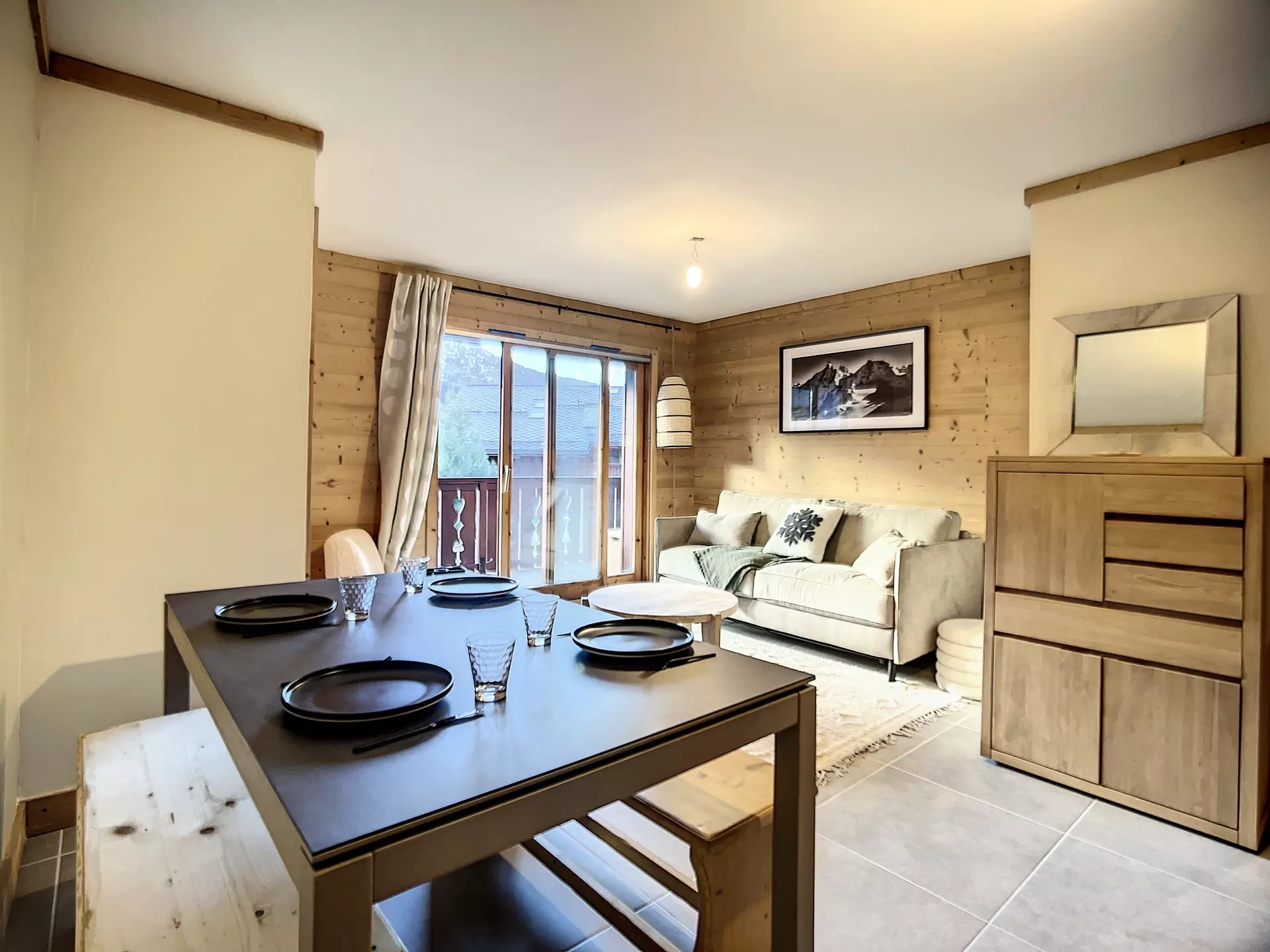 Salon donnant sur balcon avec vue sur les montagnes
