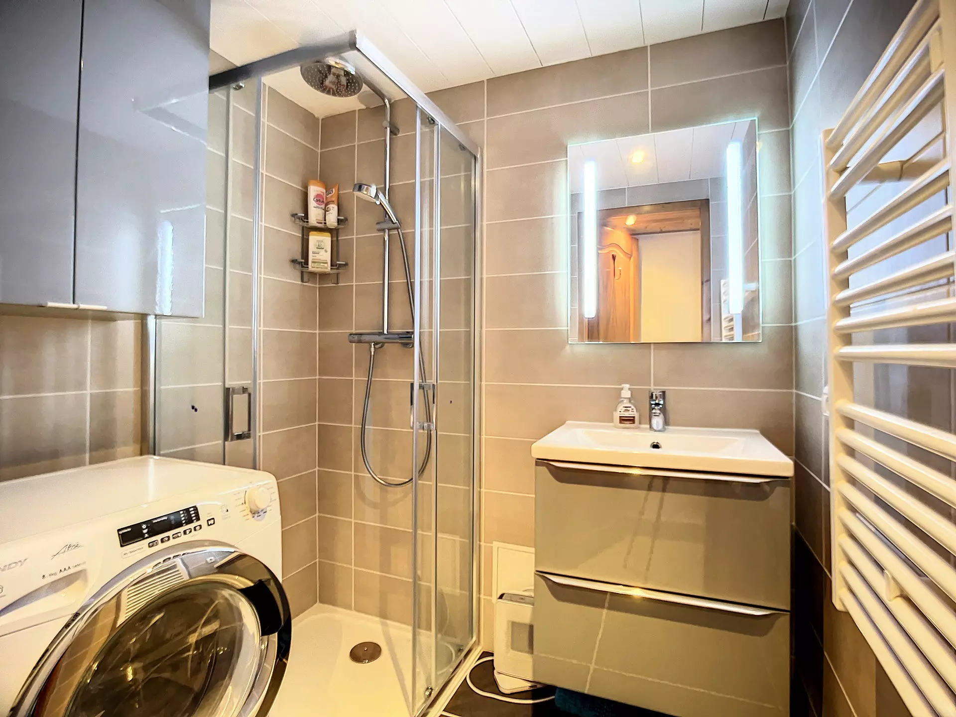 Salle de bain avec douche et lave-linge/séchant