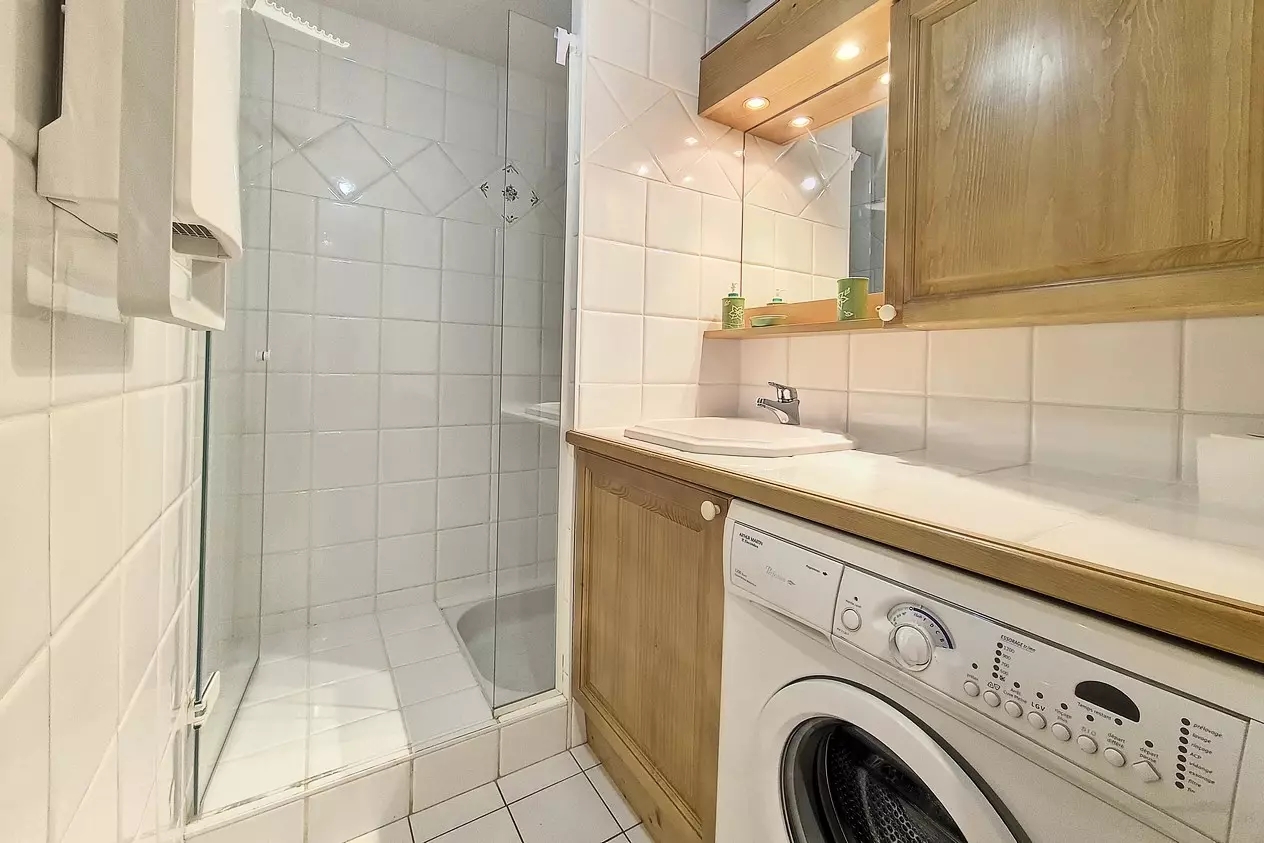 Salle de bain avec douche et lave-linge