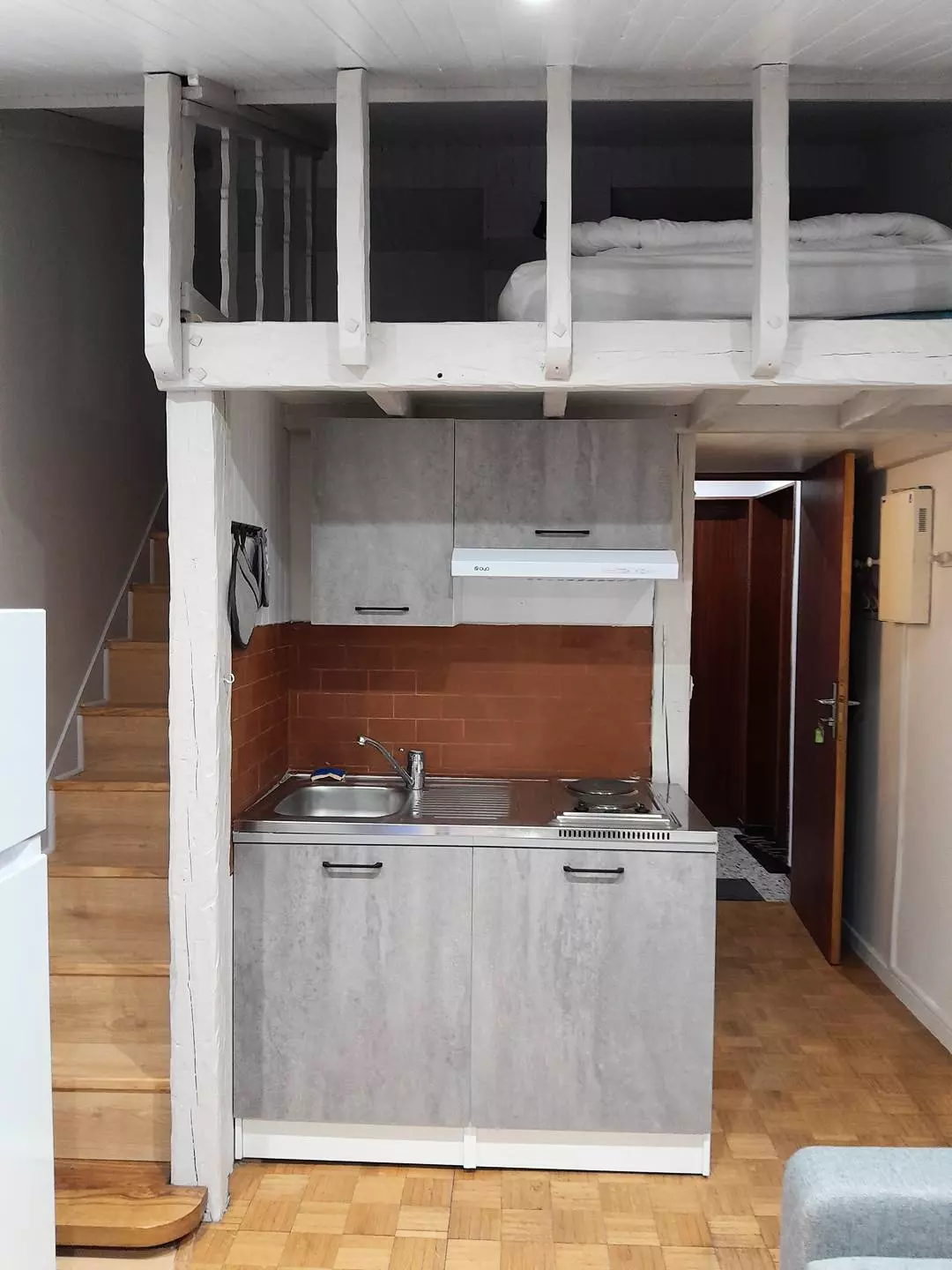 un séjour avec coin cuisine, une salle de douche avec WC, une mezzanine avec lit double (140x190cm), ainsi qu'un casier à ski.