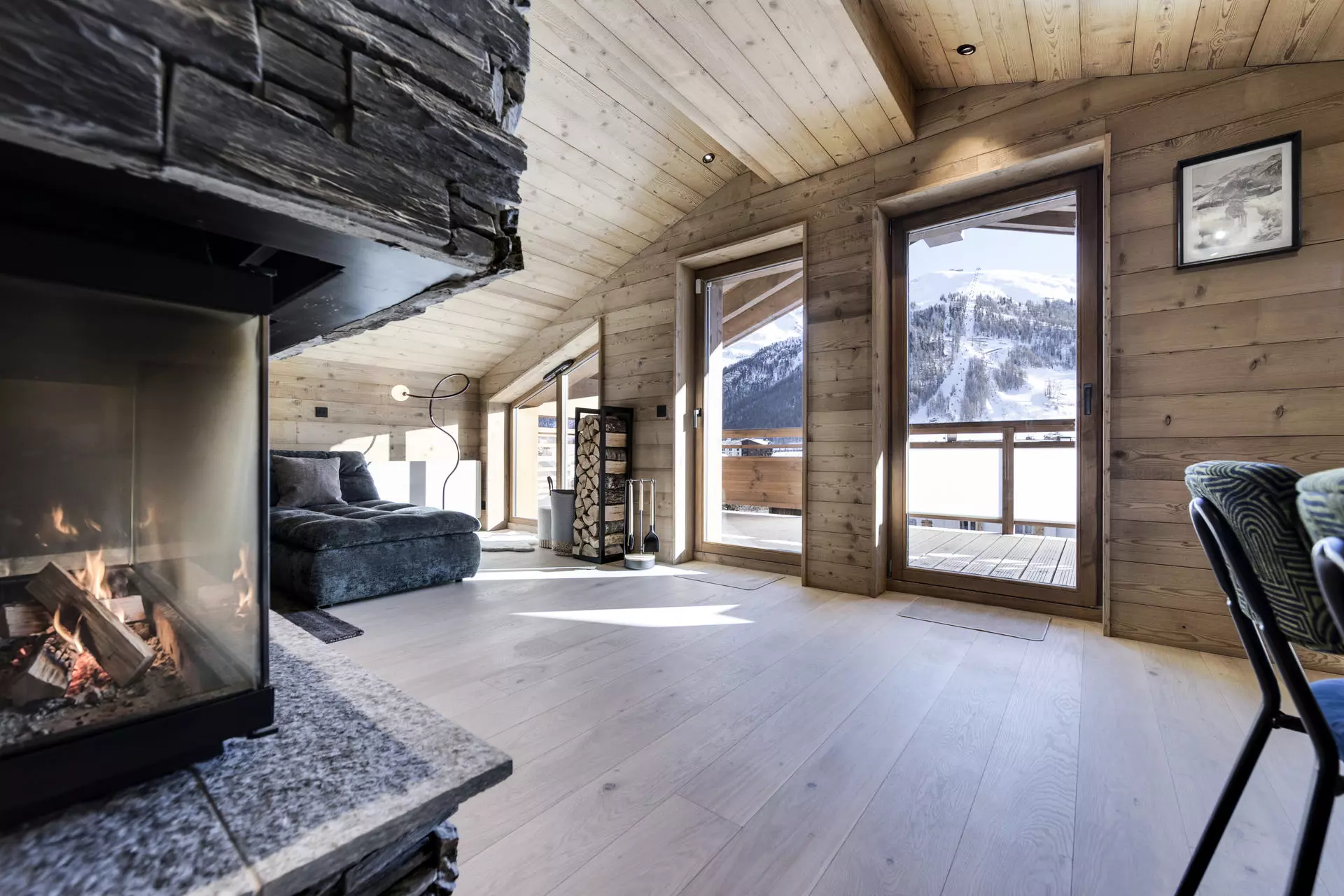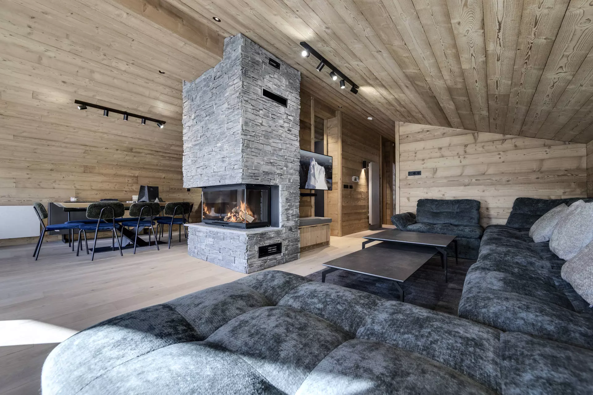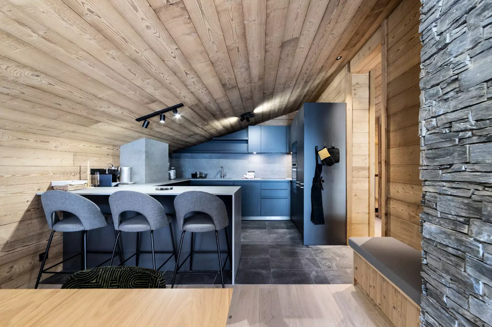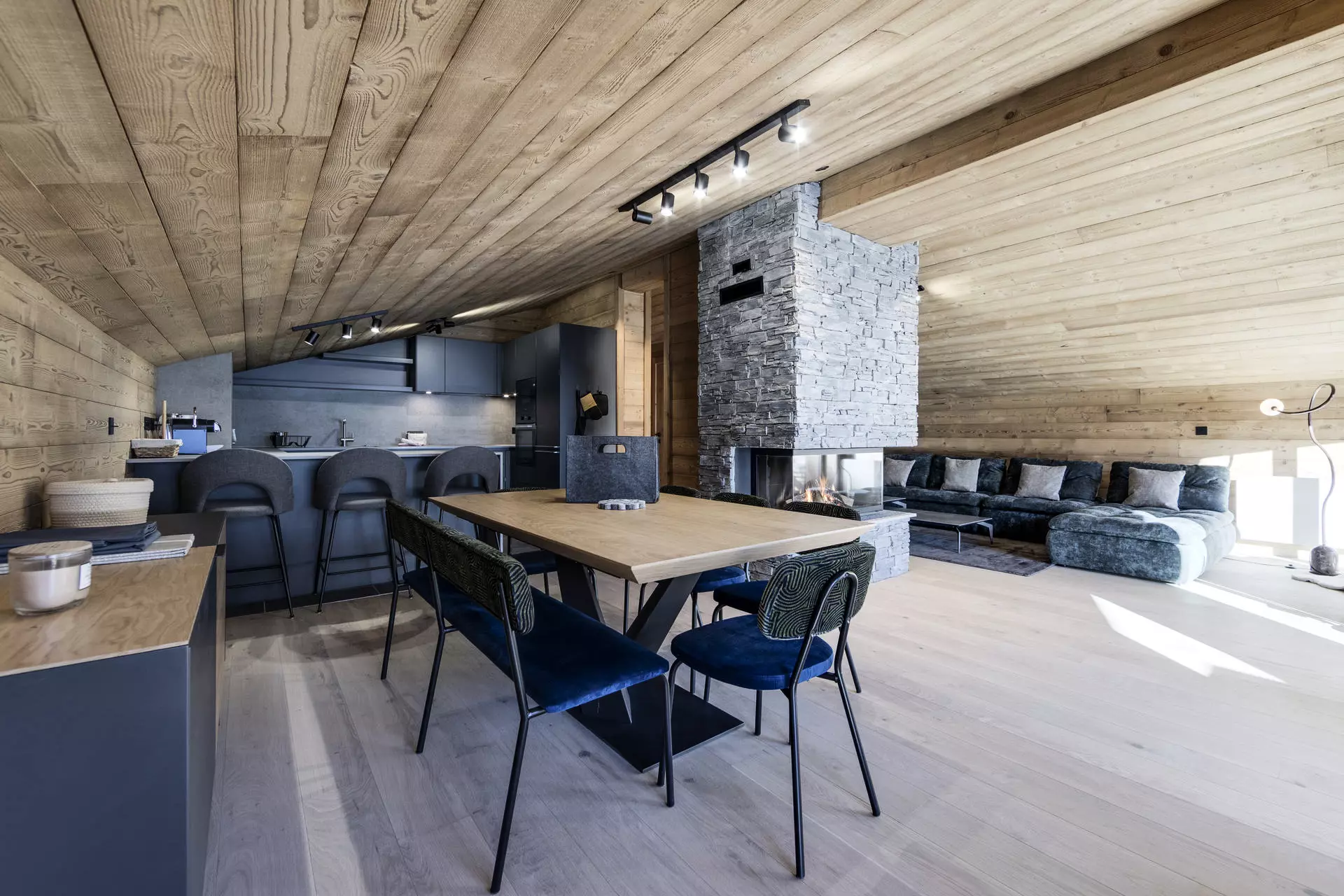 La décoration haut de gamme, au style contemporain et à l'ambiance traditionnelle mélange les matériaux alpins tels que le métal, le vieux bois, la pierre, etc.