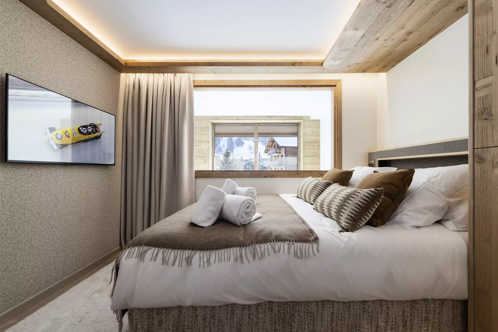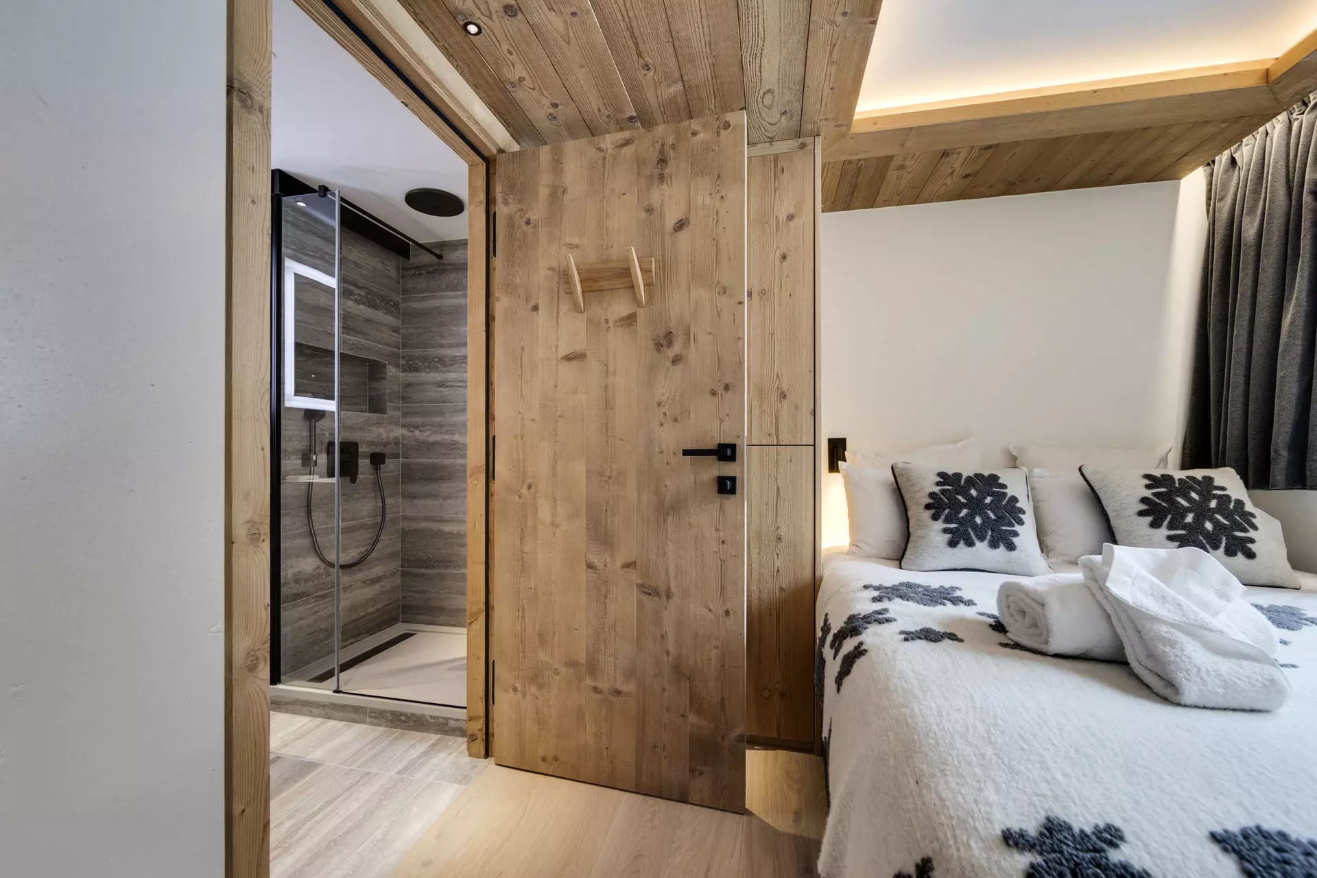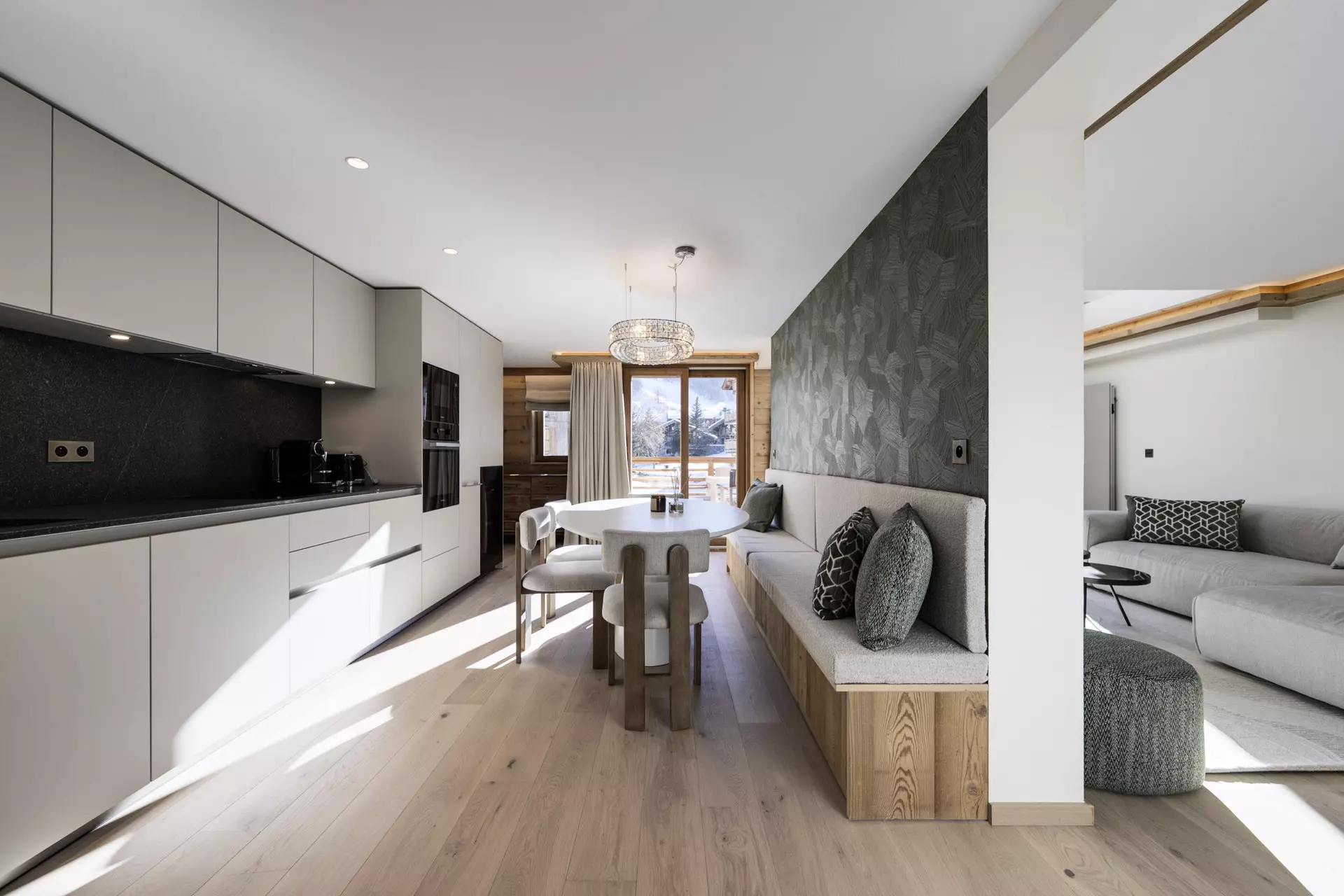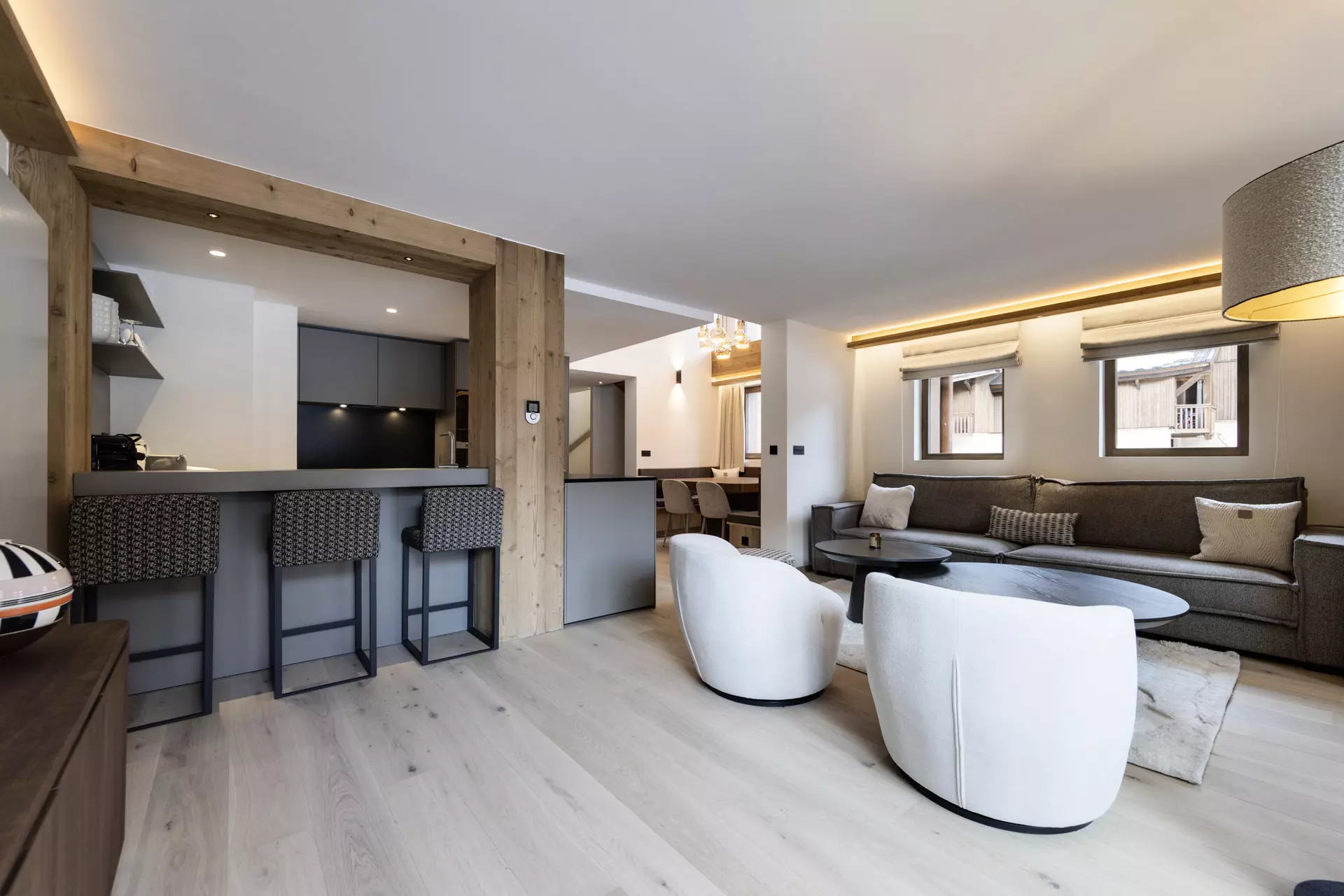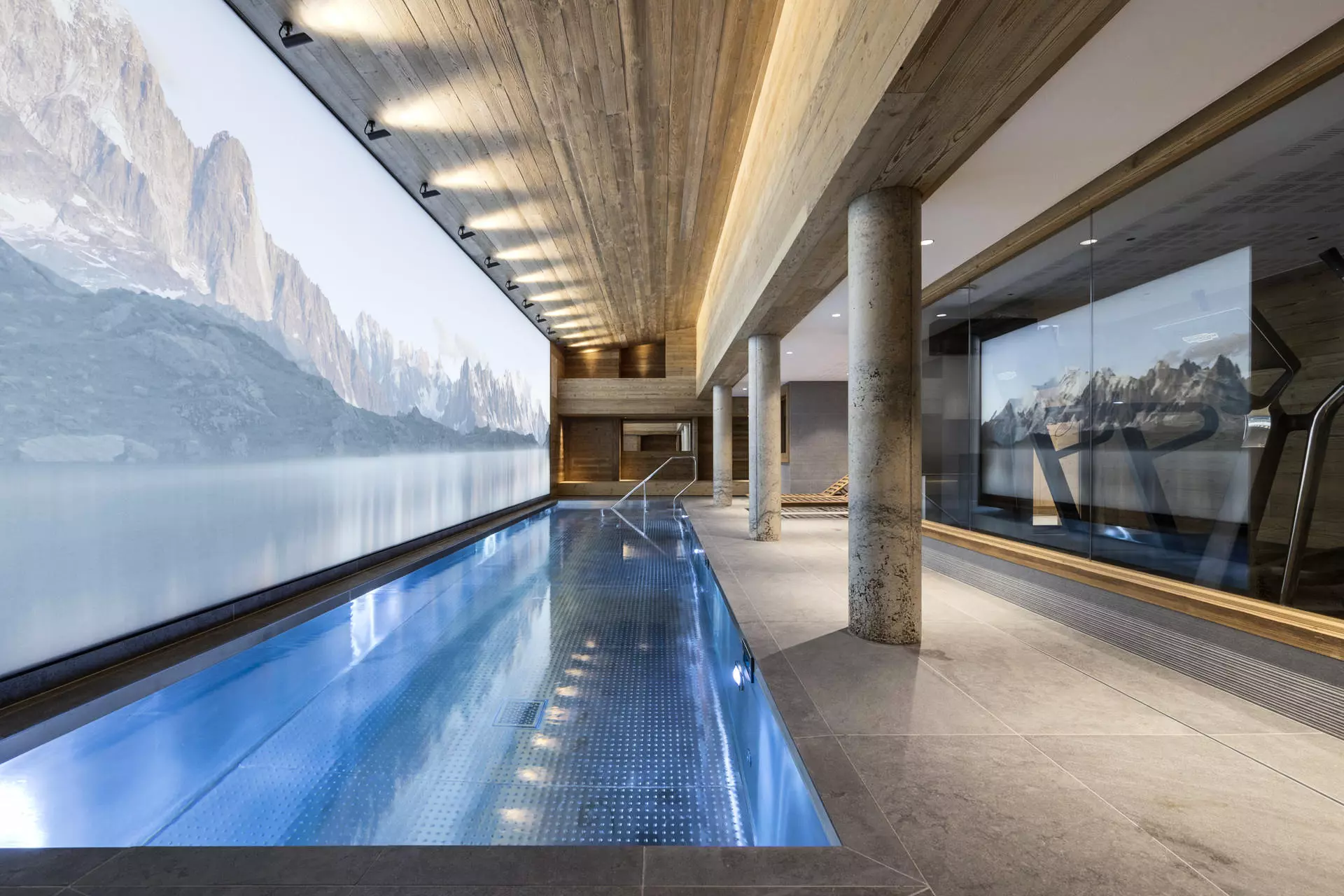 La décoration haut de gamme, au style contemporain et à l'ambiance traditionnelle mélange les matériaux alpins tels que le métal, le vieux bois, la pierre, etc.