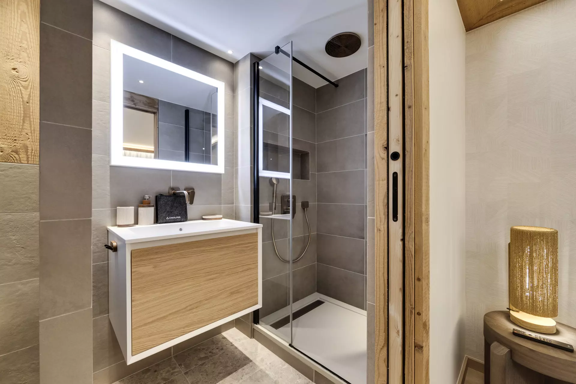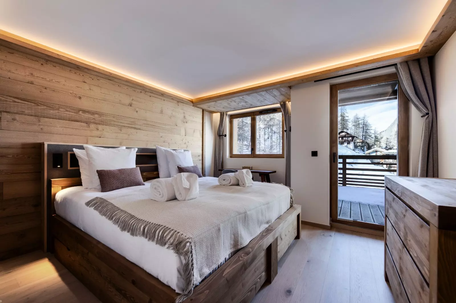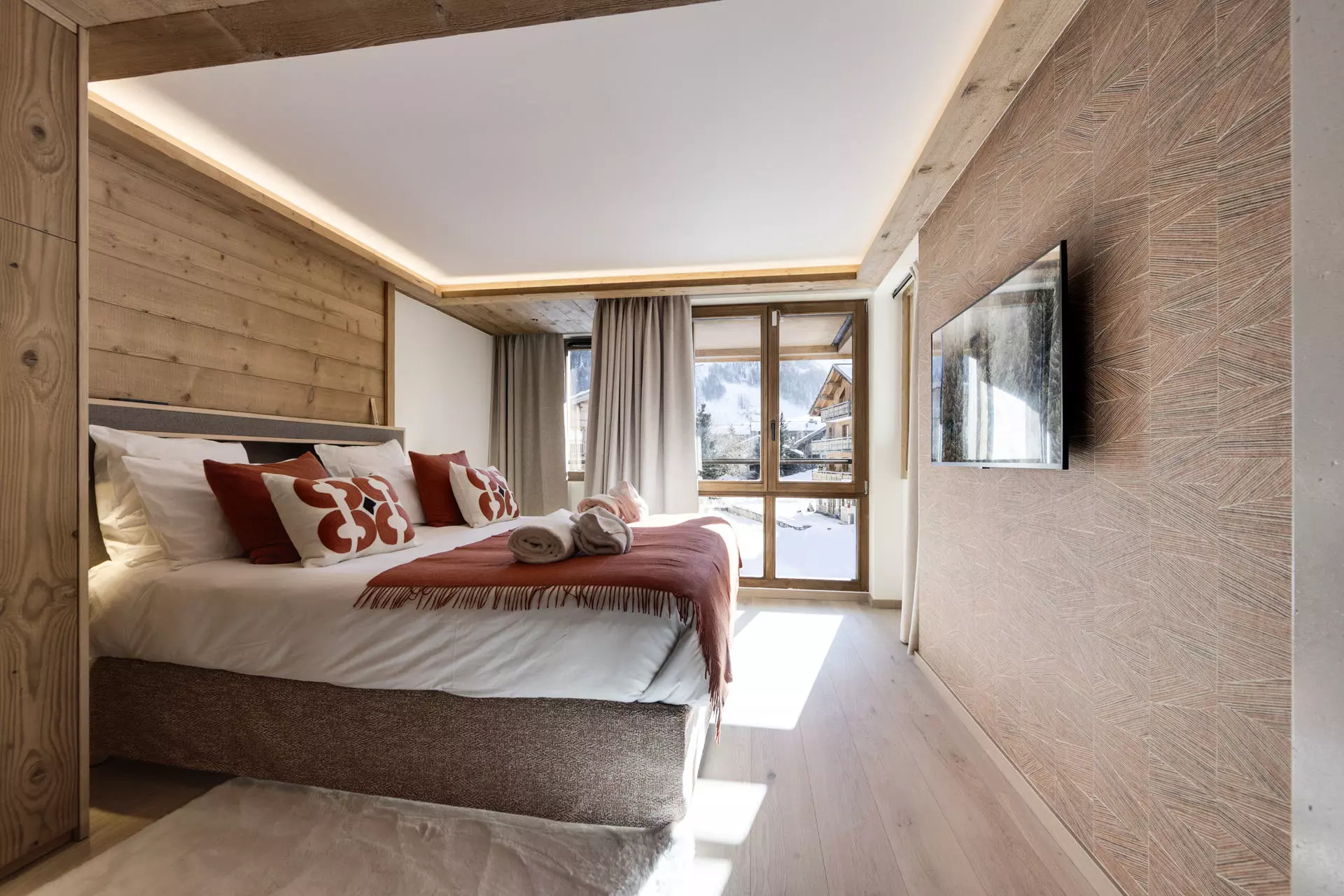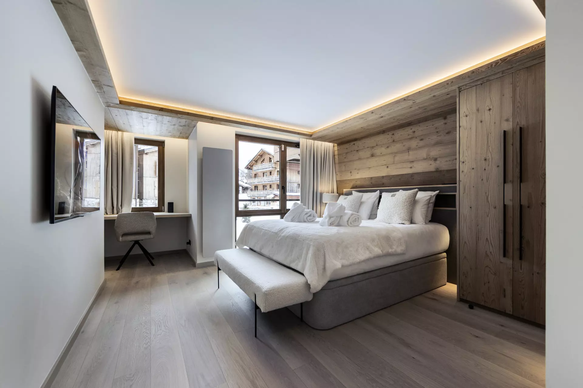 La décoration haut de gamme, au style contemporain et à l'ambiance traditionnelle mélange les matériaux alpins tels que le métal, le vieux bois, la pierre, etc.